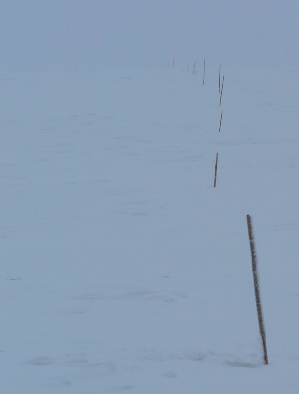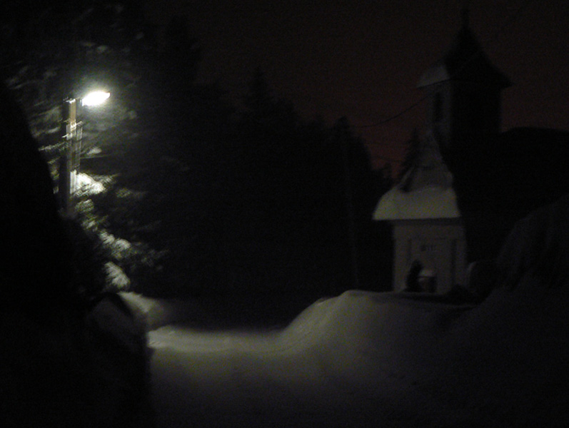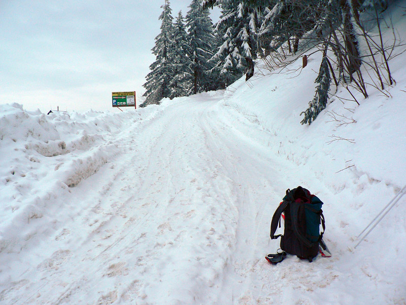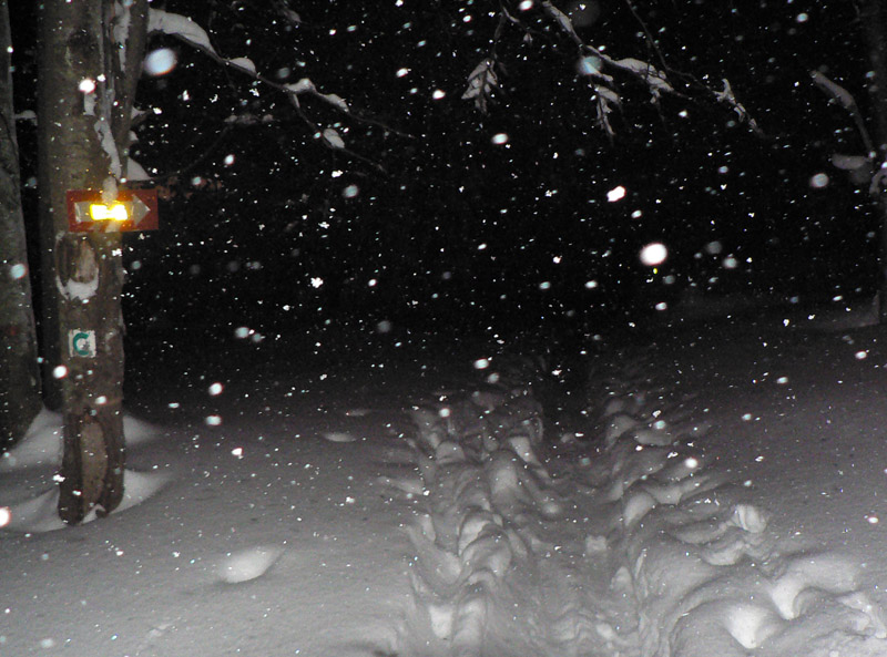 Zo sedla idem lyžiarskou cestou, tam je stopa síce napoly zaviata, ale predsa na dnešné podmienky prudko komfortná. A konečne niečo vidím. To ale definitívne prestáva platiť na lúkach okolo Hadľanky, lebo biela tma sa mení na sivú a postupne na sýtu čiernu. Ale tyčovanie vidieť a keď asi na tretí pokus triafam aj vjazd do lesa (už s lampou), mám vyhraté. Orientačne to bolo ozaj od začiatku vďaka husto nastokaným tyčiam bezproblémové, trafiť by sa dalo aj za tmy. Napriek tomu zo sedla na Polianku mi to trvá v tom prašane skoro dve hodiny. Zato z Polianky dole korčuľujem po ceste ako besný, lebo zisťujem že o 10 minút mi idú tri autobusy a potom až o hodinu taký, do ktorého sa isto nezmestím. Našťastie stíham - šprintom cez cestu, keď už ten tretí takmer zatvára dvere. Zas to perfektné načasovanie :-)