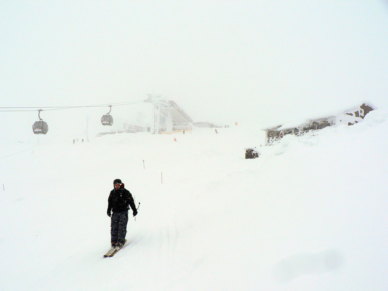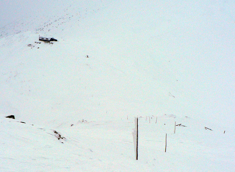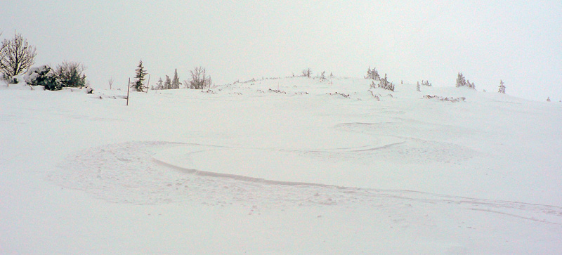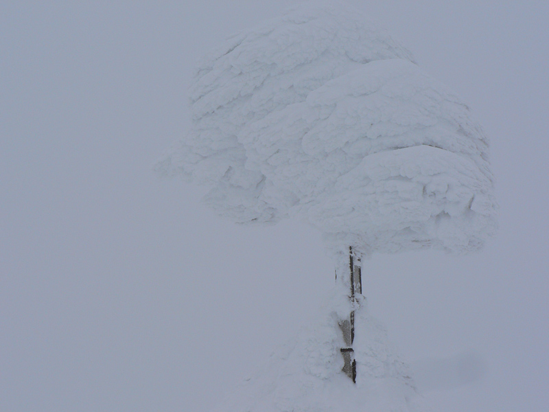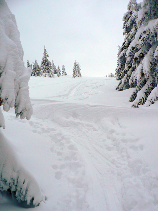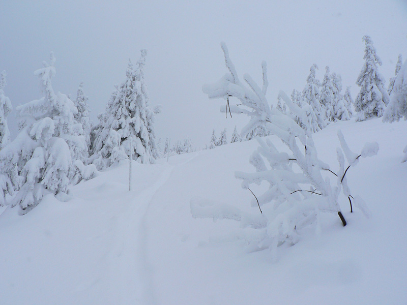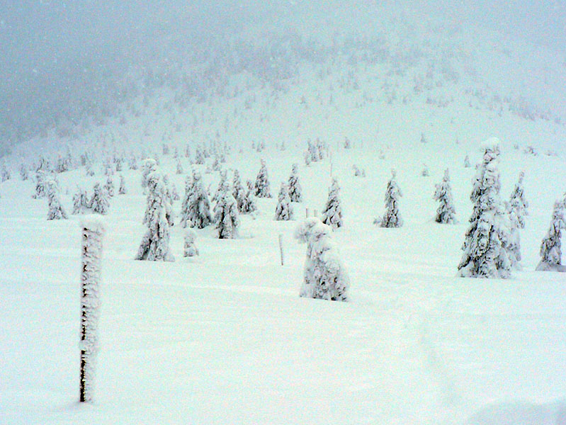 O siedmej prichádza na Čertovicu bus z BB, skáčem rovno do záveja a o chvíľu už sa rozdýchavam smerom na Lajštroch. Ten je aj jediným kopcom, ktorý ešte vidím celý - mraky síce visia tesne nad hrebeňom, ale rýchlo klesajú a začína snežiť. Nového snehu je veľa aj bez toho čo práve padá, ale stopa zatiaľ rýchla. Je nedeľa, s tým som rátal že mi to tu niekto v sobotu prešliape. Ale za Lajštrochom koniec, môj dobrodinec to otočil. Po Štefáničku to ešte ide, hrebeň je vyfúkaný na tvrdý podklad, ale nie na ľad. Najhoršie sú zjazdy - nič nevidno pod nohy a striedajú sa plochy starého snehoľadu so závejmi. K tomu snehové rebrá, vyfúkané vetrom. Z Králičky k chate radšej vyzúvam a dole kopcom beriem lyže do rúk. Aj tak hádžem držku. Inak dokopy ich bolo za celý deň len zo päť, ale rovnováhu (dopredu či doboku) som stratil asi 100x :-)