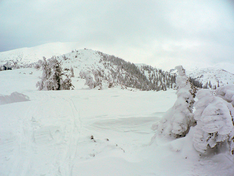 Po Chopok je to niečo podobné, miestami prerážam sneh po kolená, miestami (samozrejme hlavne v zjazdoch) sa mecem na tom ľade ako koza na ľade :-) Telo odmieta spolupracovať, ale hlava nepopustí, tak trpí a šliape. Utešujem ho tým, že ak to nepôjde, najneskôr z Poľany to otočím a po zjazdovkách zídem na Trangošku na bus.