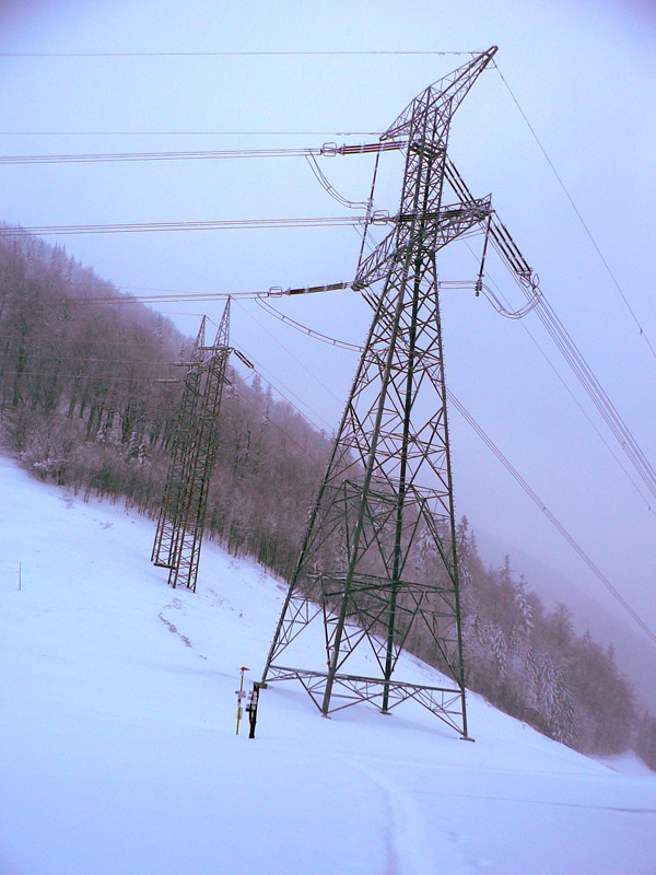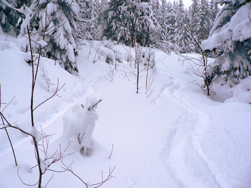 Popod Dereše je to riadny boj, chodník je v závetrí a vietor tu toho naukladal až - až. Pred sedlom Poľany stretám dvoch a neskôr ešte dvoch ľudí, všetci idú z Ďurkovej. Vraj je to ďalej celkom dobré, moc sa to neborí. Teším sa že konečne bude stopa, ale už pod Kotliskami je beznádejne zaviata. Asi dvakrát sa v mrakoch ukáže žlté koliesko, dáva nádej. Ale sneží čoraz hustejšie, len vietor našťastie fúka do chrbta.