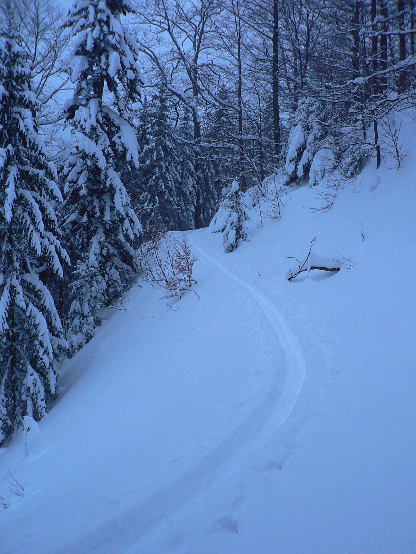 Na Prašivej prašivé počasie - vietor do očí, musím lyžiarske okuliare nasadiť. Aspoň rýchlosť zvyšujem, po vyfúkanom. Prvý raz pásy dolu - ale lyžovačka nič moc, vrstva ufúkaného snehu je ťažko lyžovateľná a chytá lyže, zle sa vedú do oblúkov. Satisfakcia prichádza až v lese nad Hiadeľským sedlom, tam je už taký „originál kanadský“ prašan. Ospravedlňujem sa, ak som niekde rozbil chodník, snažil som sa ísť pomimo.