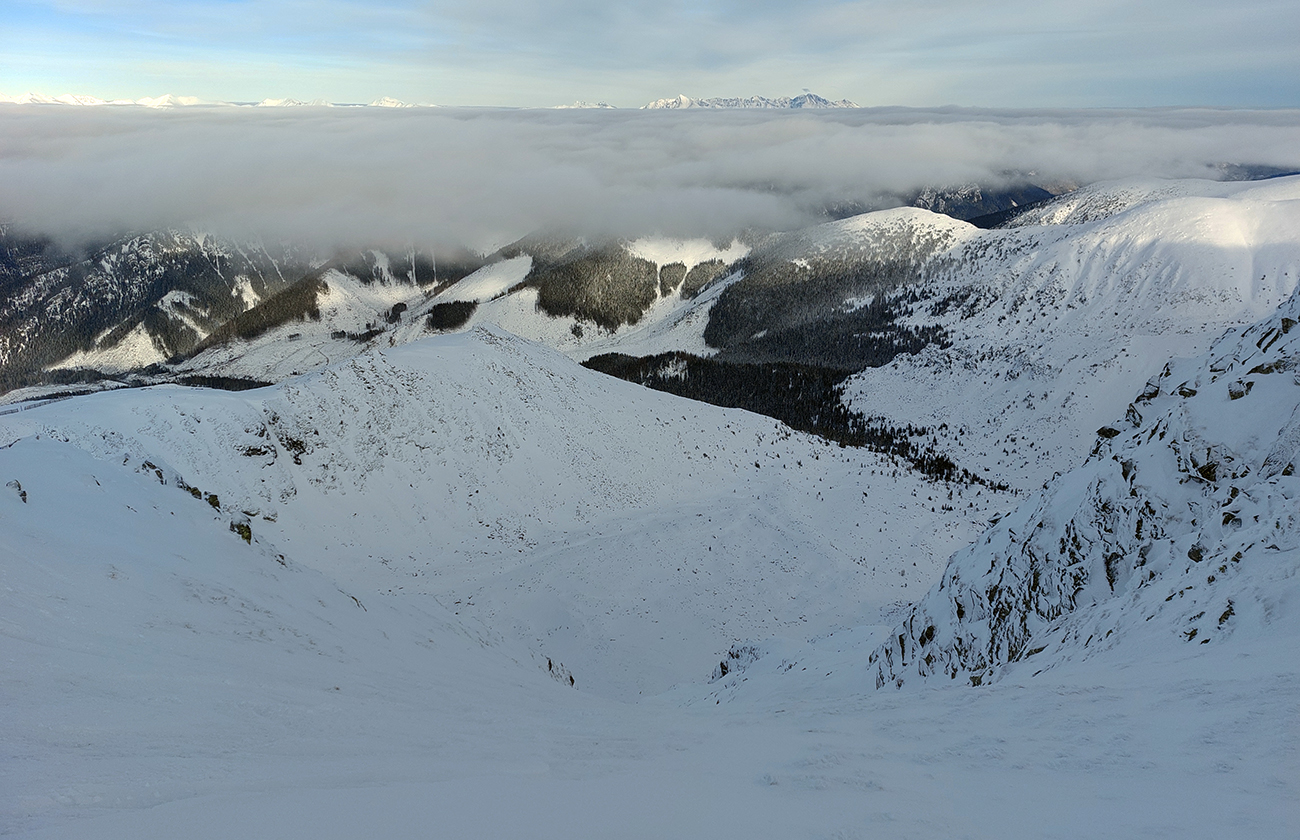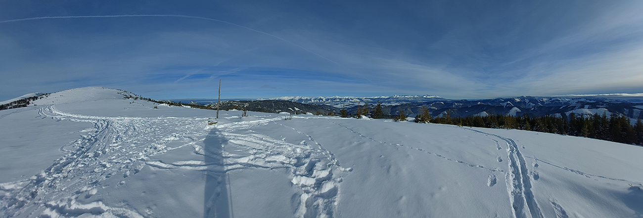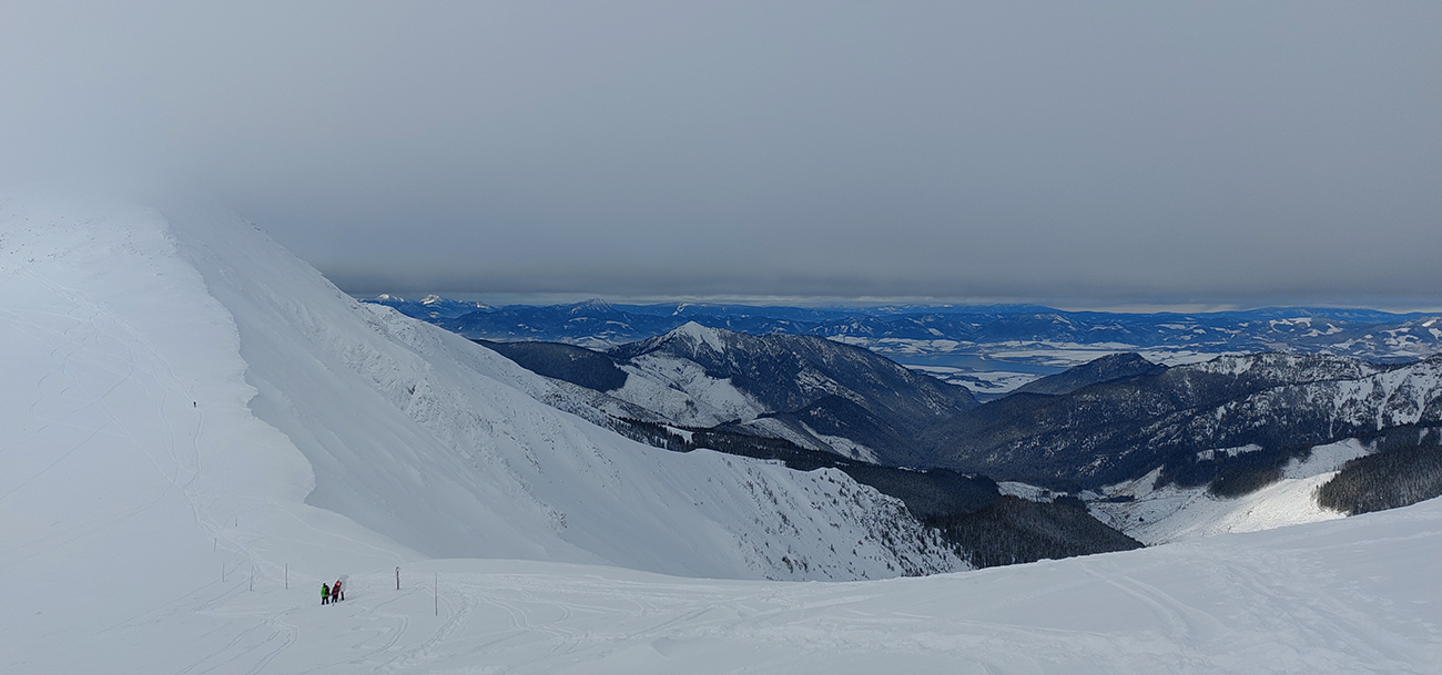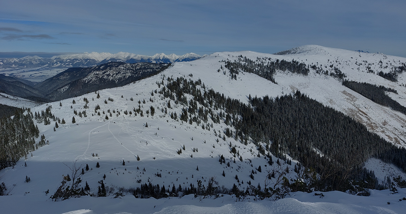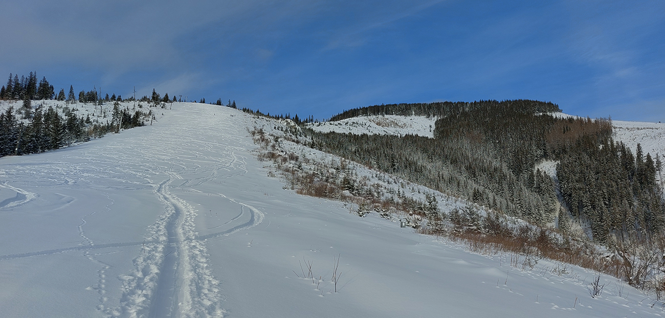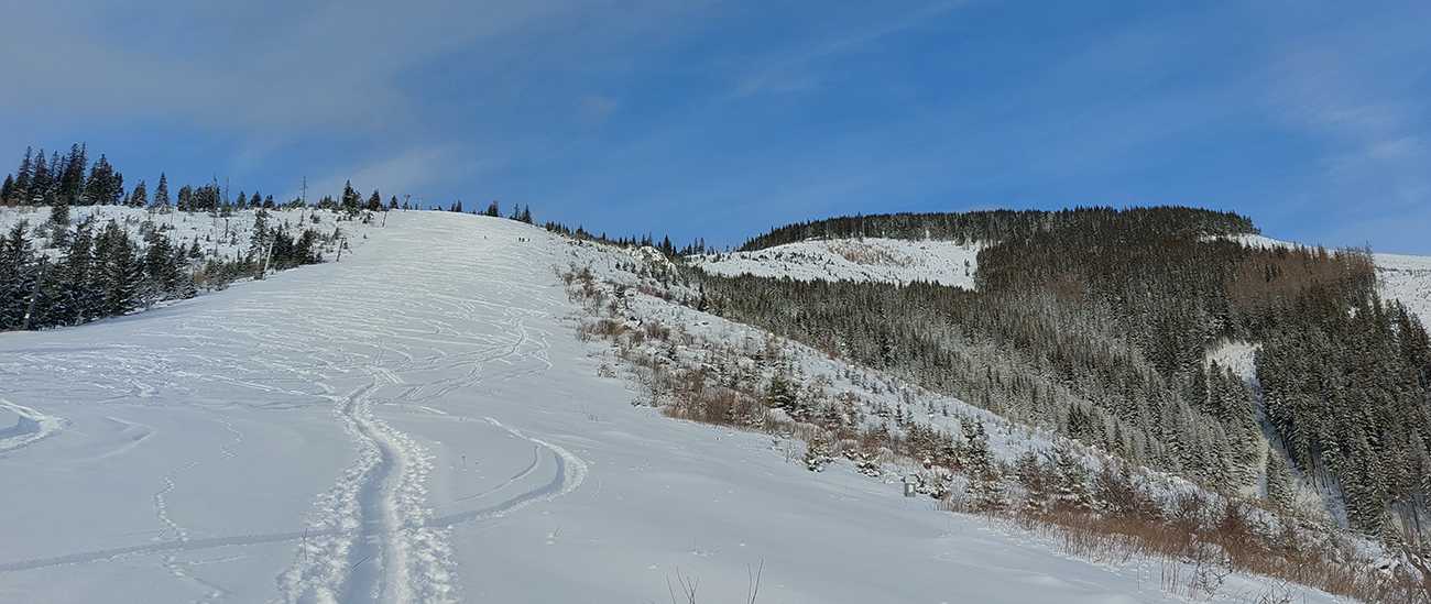 Už začiatok zjazdovky z Vyšnej Boce je strmý a takých úsekov ešte zopár bude, tak nahadzujem „celoplošné“, presne na lyže orezané bezlepkové Gecká, nech to drží. Slúžia dobre už pár rokov. Vlekári ma posielajú pekne za kraj uratrakovanej pisty, ale stopa komfortne vytvrdená, dokonca aj otočky precvičím na pár miestach. Výhľady s naberaním výšky parádnejú, len škoda, že na začiatku hlavne na vyholené svahy v okolí. Nad prvým vlekom sa sklon zmierni, nad druhým vchádzam na chvíľu do lesa (do zvyšku lesa). Vpravo Tatry, vľavo Tatry, no nádhera.