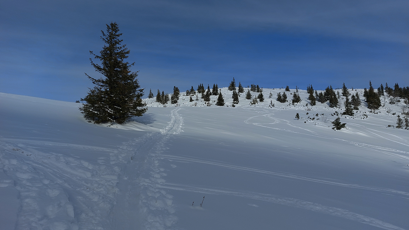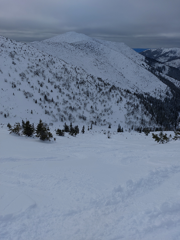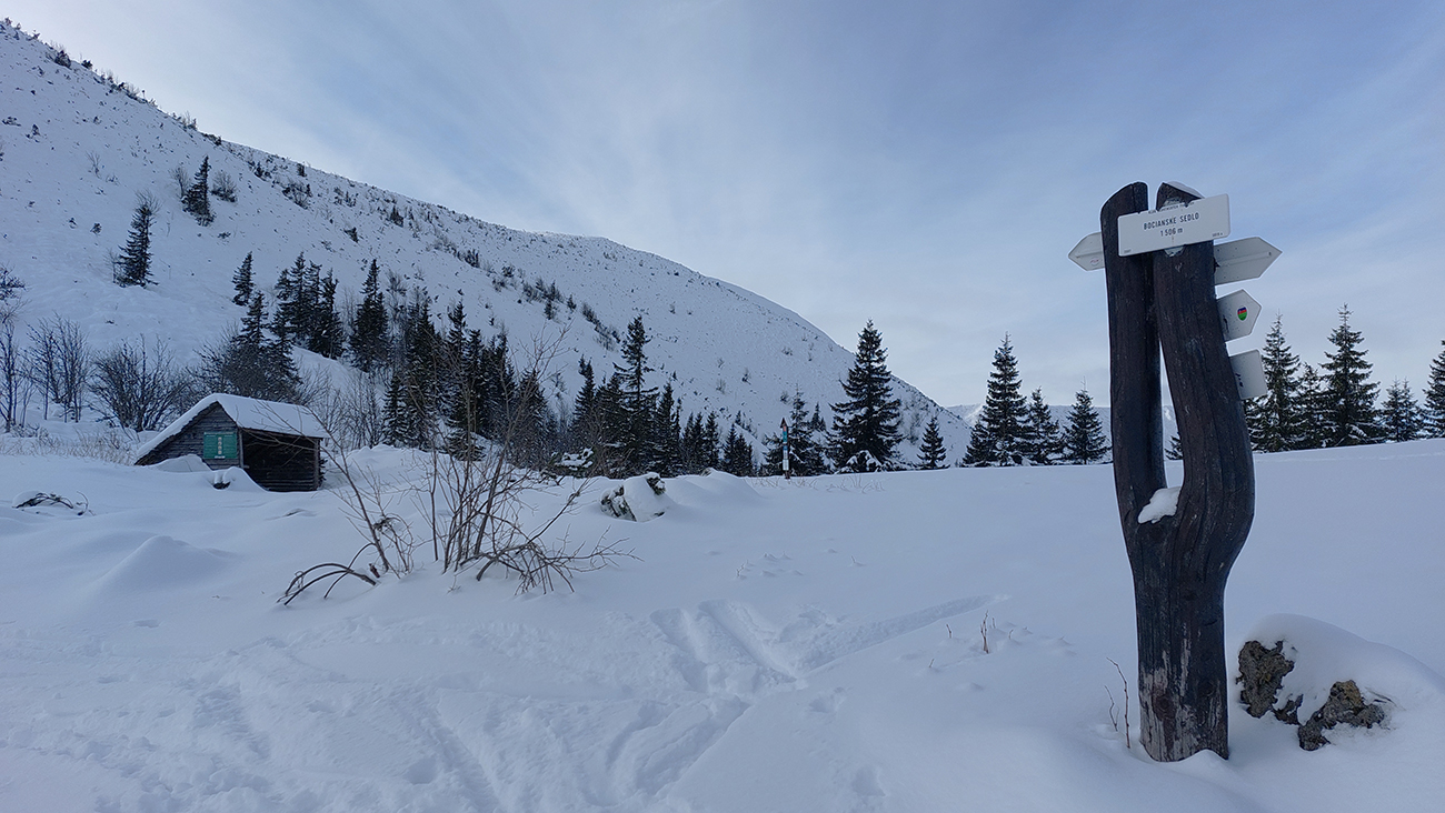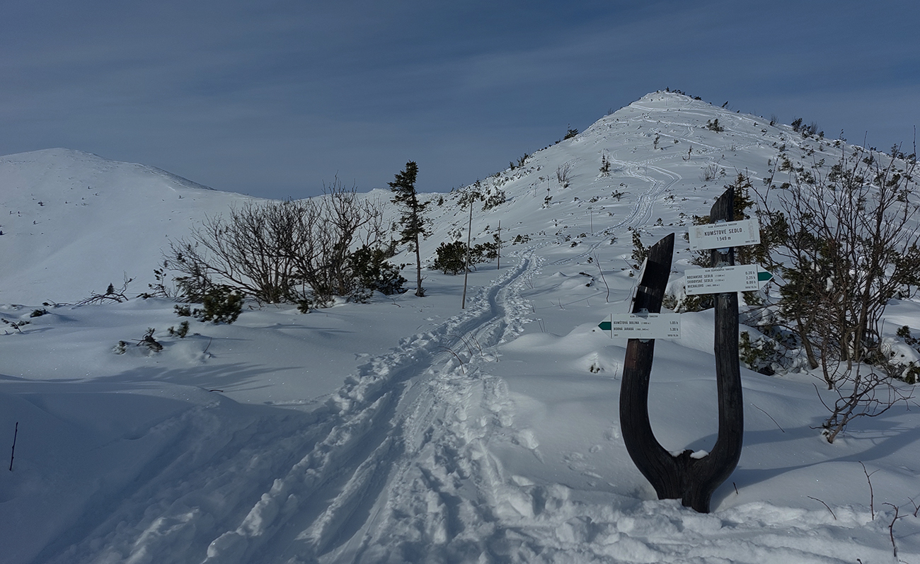 Pásy odliepam až kúsok nad Bocianskym sedlom (na vyhliadke do záveru doliny Štiavnice) a užívam si peknú, aj keď opatrnú lyžovačku. Opatrnú preto, lebo prášok leží na nie úplne dokonale nosnej starej kôrke. Miestami hrabnem lyžami až do čučoriedok. Znovu naliepam na okraji lesa a o chvíľu som nazad v Bocianskom sedle. Čaká ma rozhodovanie, kade na hrebeň, ale rýchlo je to vyriešené – prešliapaný je len traverz do Kumštového sedla (zelená značka).