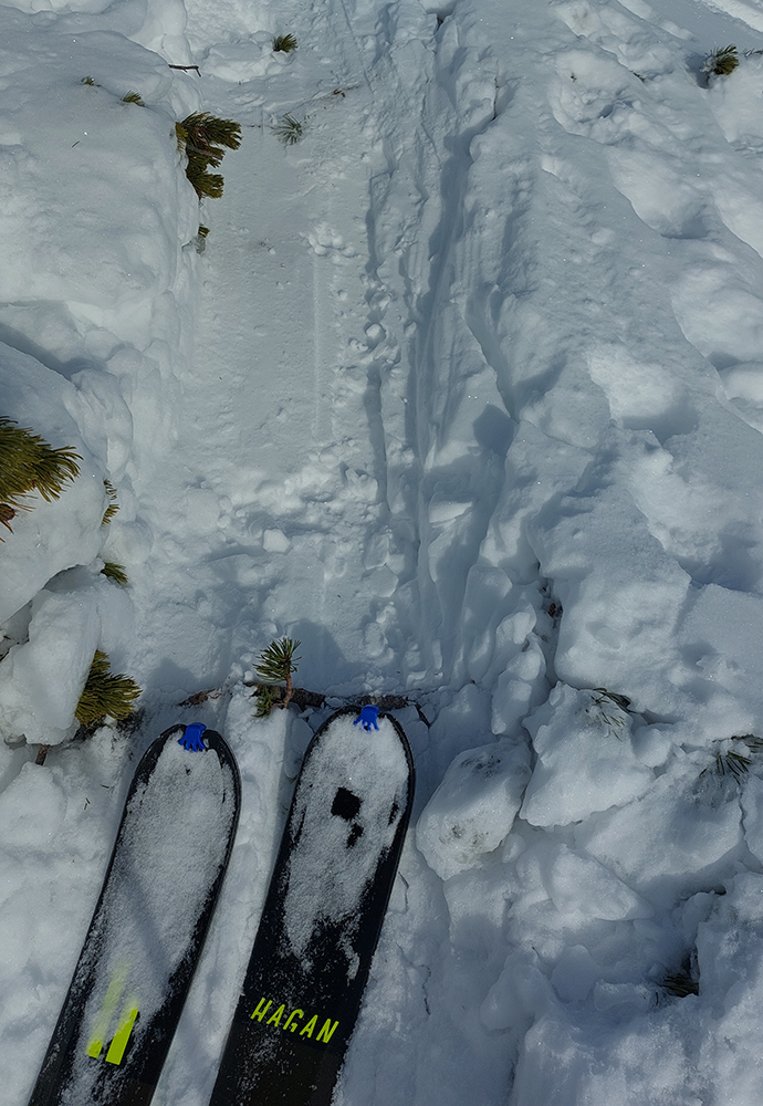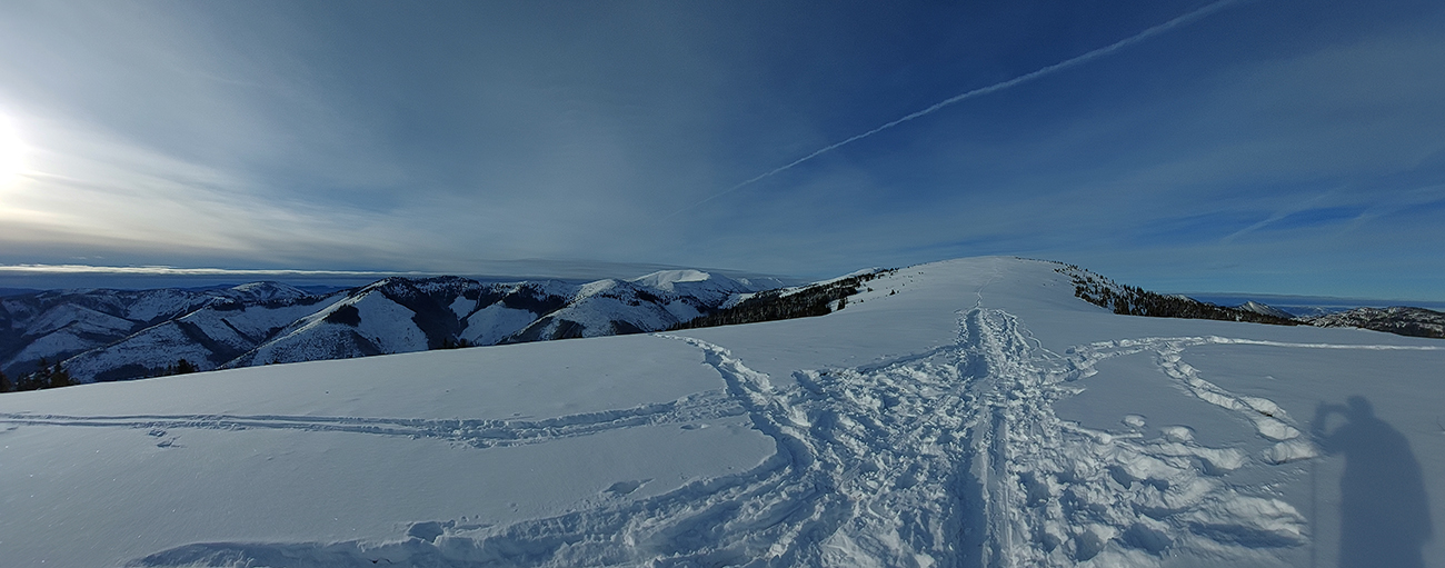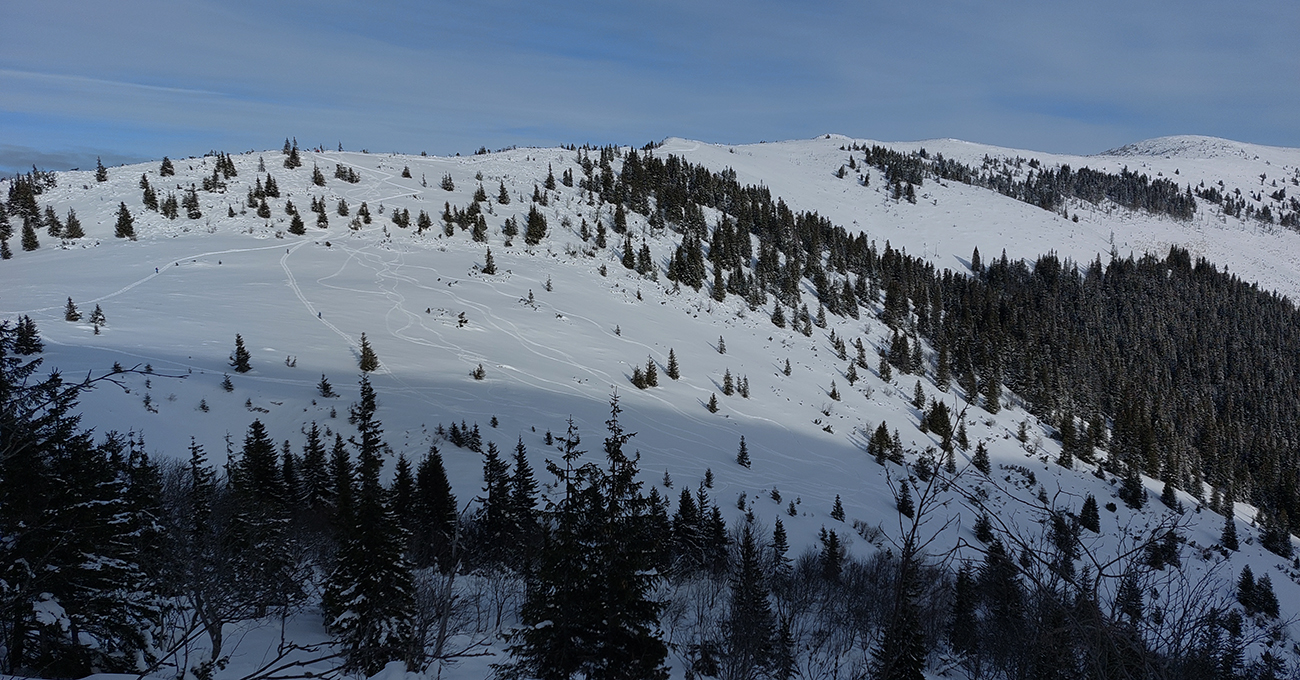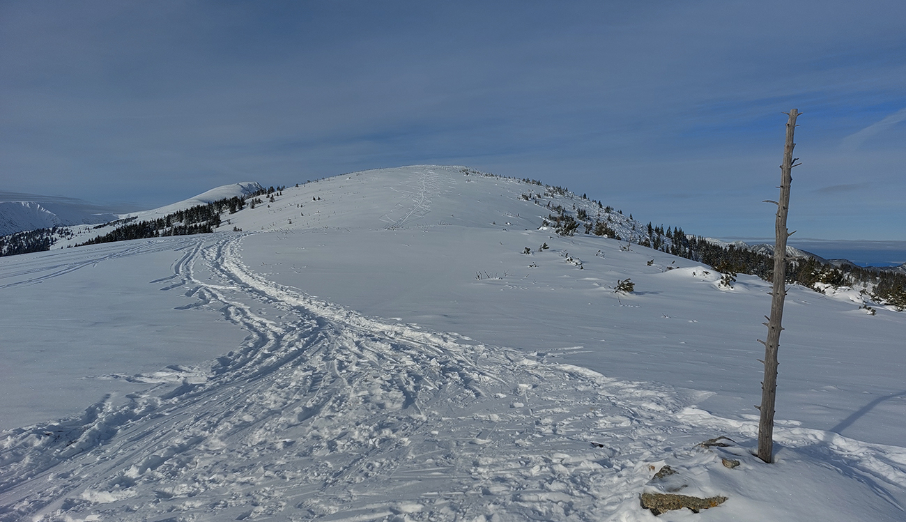 Pásy odliepam až kúsok nad Bocianskym sedlom (na vyhliadke do záveru doliny Štiavnice) a užívam si peknú, aj keď opatrnú lyžovačku. Opatrnú preto, lebo prášok leží na nie úplne dokonale nosnej starej kôrke. Miestami hrabnem lyžami až do čučoriedok. Znovu naliepam na okraji lesa a o chvíľu som nazad v Bocianskom sedle. Čaká ma rozhodovanie, kade na hrebeň, ale rýchlo je to vyriešené – prešliapaný je len traverz do Kumštového sedla (zelená značka).