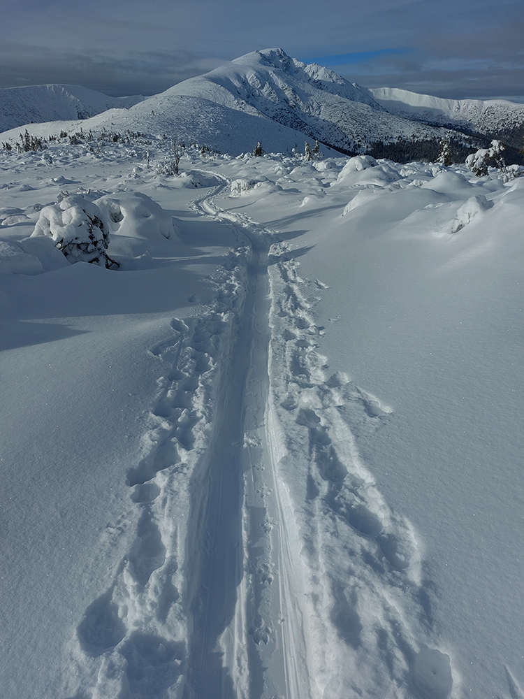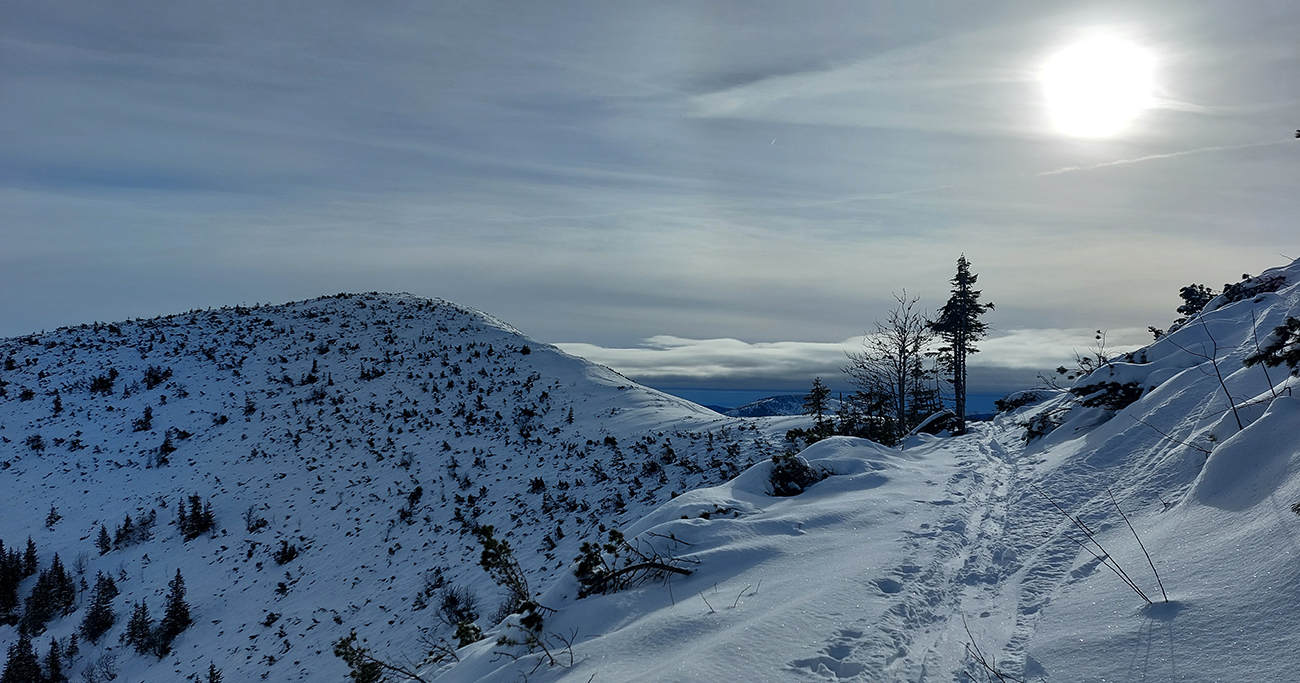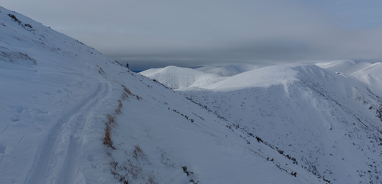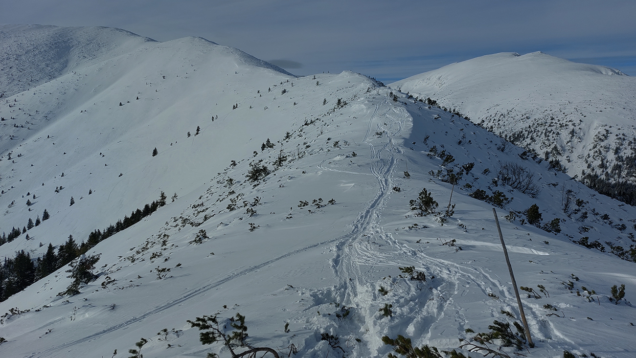 Ani na hrebeni nefúka, je síce hlboko pod nulou, ale slniečko svieti, čo viac chcieť? No, hádam len viac snehu, lebo stopa je tu často „prizdobená“ konárikmi kosodreviny, trčiacimi spod snehu. Ale na december dobré... Už sme asi zvyknutí aj na horšie, že? Túto hrebeňovú klasiku každý pozná, teraz je komfortnejšie ísť v mojom smere, viac do kopca. Aj vrchol Králičky podchádzam letným traverzom, aby som na pásoch nemusel z kopca kľučkovať pomedzi kadečo nepríjemné. Podobne posledný úsek ku chate – z toho krátkeho kopčeka to nie je príjemné, tam aj šutre trčia.