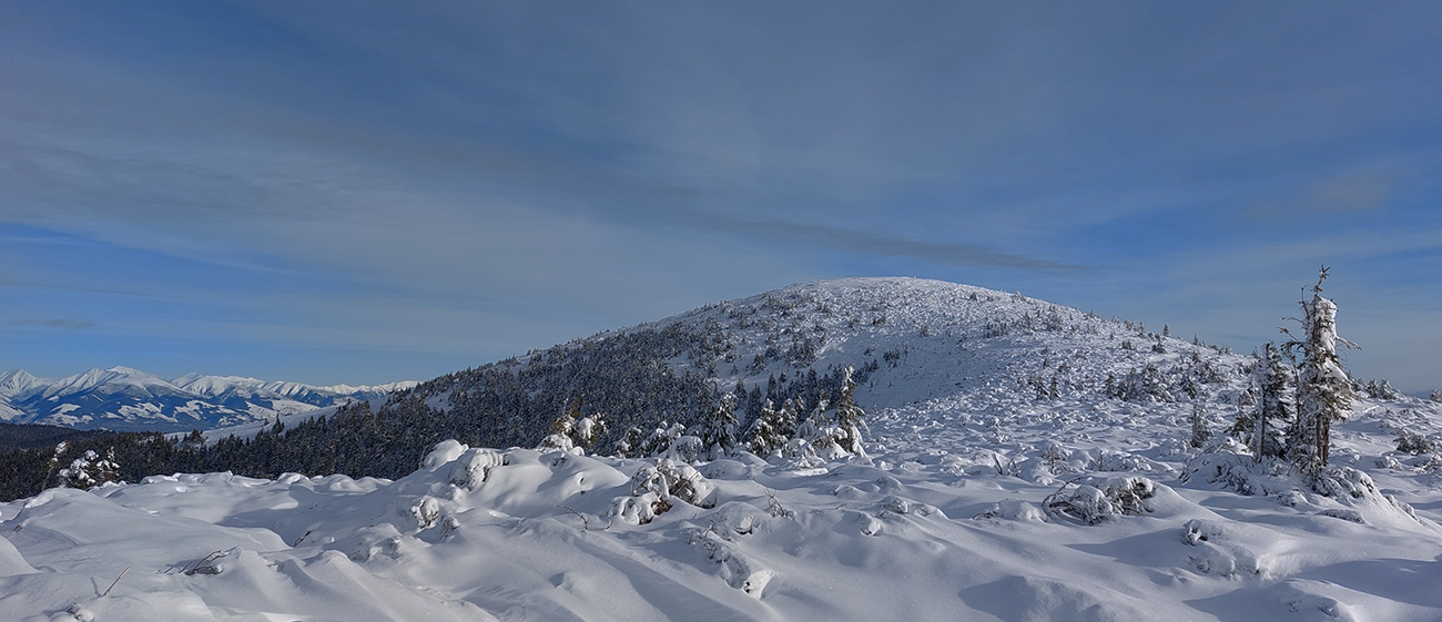 Východ z lesa znamená hole, rúbaniská ostali nižšie. Výhľady do ďaleka sú v priezračnom vzduchu grandiózne. To už som na kopci - Chopci (1548 m), vrtím sa na všetky strany okolo drevenej vrcholovej tyče ako barová tanečnica. Predo mnou skororovinka na Rovnú hoľu (1723 m), odtiaľ je výhľad ešte kruhovejší. Všetko je pod snehom, ale bacha, len na oko! Základ slabý, prebára sa to. Z východu kľučkujem na vrchol pomedzi pahýle kríkov, na juh do Bocianskeho sedla kľučkujem mierne z kopca pomedzi ledva prikrytú kosovku. Našťastie stopa je aj tu prechodená perfektne.