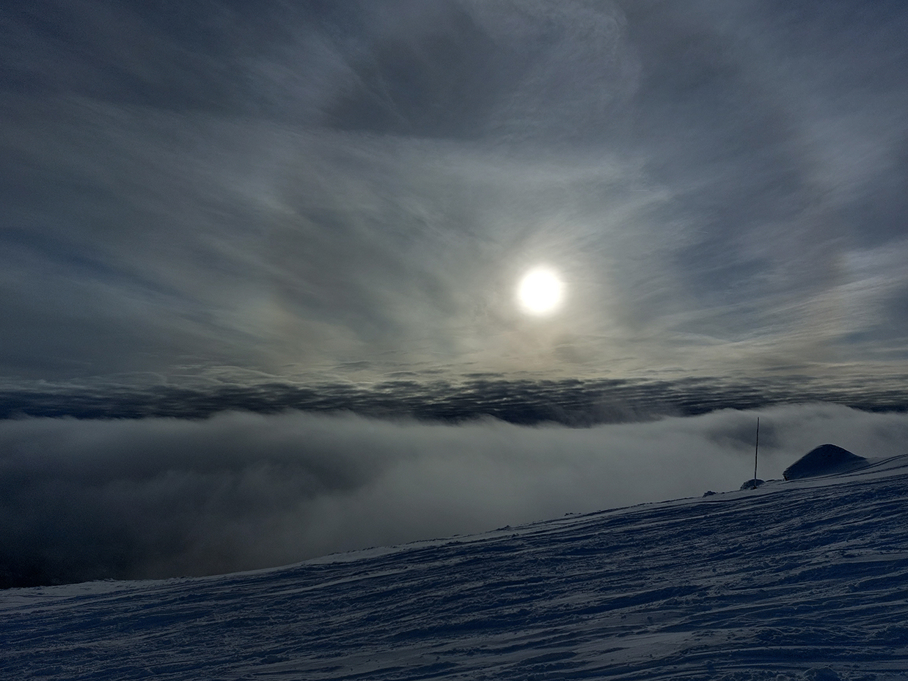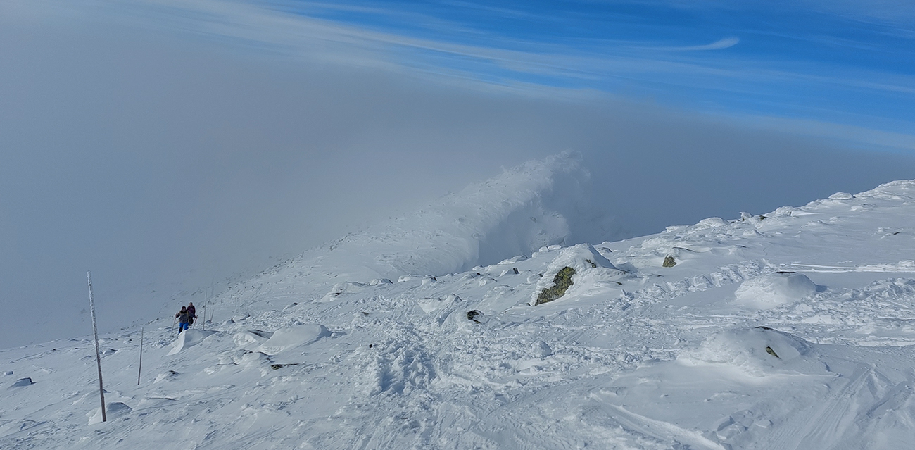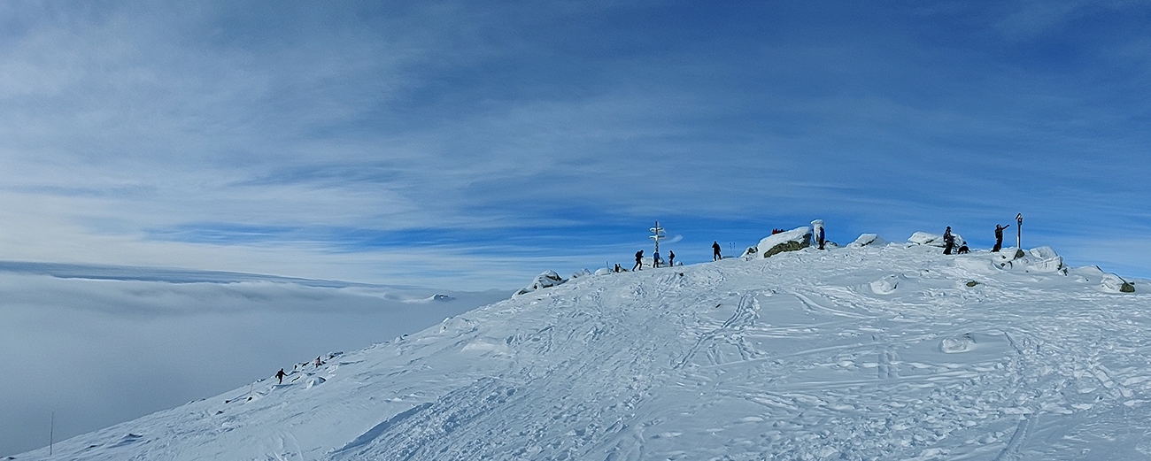 Sviatky sú, tak na Ďumbier tiahnu davy, pridávam sa k nim, ale nie už od chaty. Najskôr skúšam zlyžovať trochu nižšie, aspoň pokiaľ mi stromy nezačnú príliš zavadzať. Celkom fajn: rozlyžované síce, ale nepopísané miestečká sa ešte nájdu. A tu sa to takmer vôbec neprepadáva. O chvíľu už sa ale ťahám priamo hore ku chate. Výživné! Nejako mi to dupanie do kopca prestáva chutiť, ale zas je ešte len začiatok sezóny, hádam sa to polepší :-) Smerom hore je to každopádne pekne udupané, od chaty vyššie aj polyžovania hodné. Ku krížu na vrchole by som ani nemal ísť, aby som dodržal predpísaný rozostup :-) Z juhu začínajú doliezať mraky - zatiaľ len také útržky, aj keď chvíľu sa zdá, že vrchol bude v mlieku.