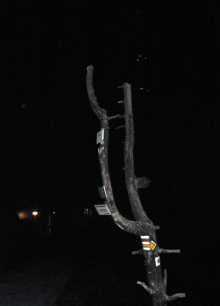 Opúšťame „ostrovček svetla a ľudského tepla v mori temnoty“ a začína ďalšia psychiatria – nekonečné serpentíny na Martinské hole. O to nekonečnejšie, že v noci, a že tu poznám každú skratku. Ale nesmiem, GPS-tracker by žaloval. Ešte že sme na to dvaja. Na hodinovke sme o 40 minút. Slabé dve hodinky pešovania a sú tu červené blikačky vysielača. A zas máme pre seba kúsok hrebeňa, po Veterné.