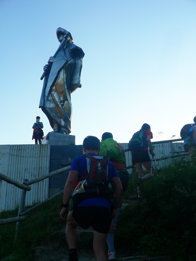 Na štarte sa cítim ako na výstave papagájov, ešte že sám som „len“ oranžovo-modro-čierno-žltý :-) Na úvod sa štveráme k plechovému Jánošíkovi, konečne poriadna symbolika. Možno na rok nás preženú jeho rodiskom na opačnej strene doliny (Maťo D., to ber ako námet!) Až potom nazad na cestu do Vrátnej – ja reku po dákej poľnej ceste sa na ňu napojíme, ale kde...