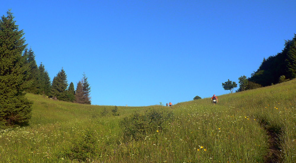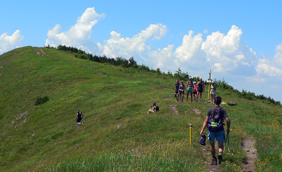 Direkt dole po orosenej tráve. Mokré nohy na úvod, super... A kto zráta, koľkí išli po zadku? No sranda. Ale potom už klasický hadík až k vlekom a odbočka doprava, do sedla Príslop popod Sokolie. Na úvodné rozdýchanie bolo naordinované trojvršie Baraniarky, Žitné a Kraviarske. A nazad dole na cestu. Brutálne kopčeky, nebolo kde si oddýchnuť: strmé do kopca, technicky náročné z kopca, navyše dav tlačí, predbiehať ani uhýbať nie je kam, ešte že síl má každý ešte dosť.