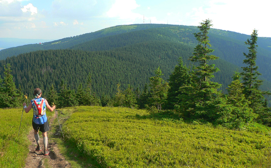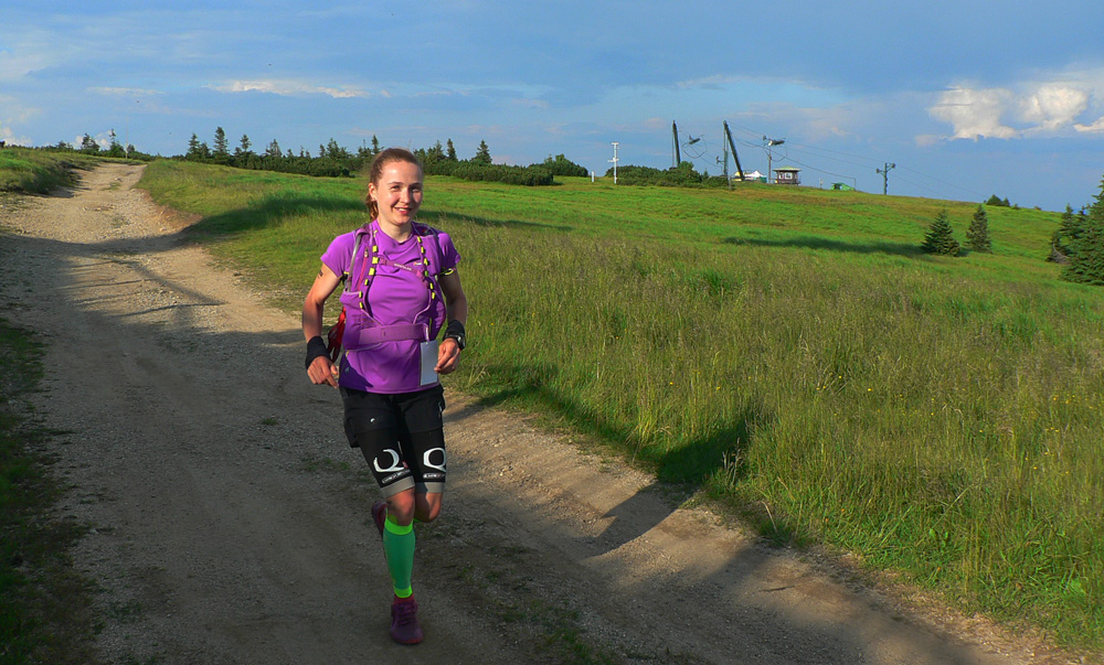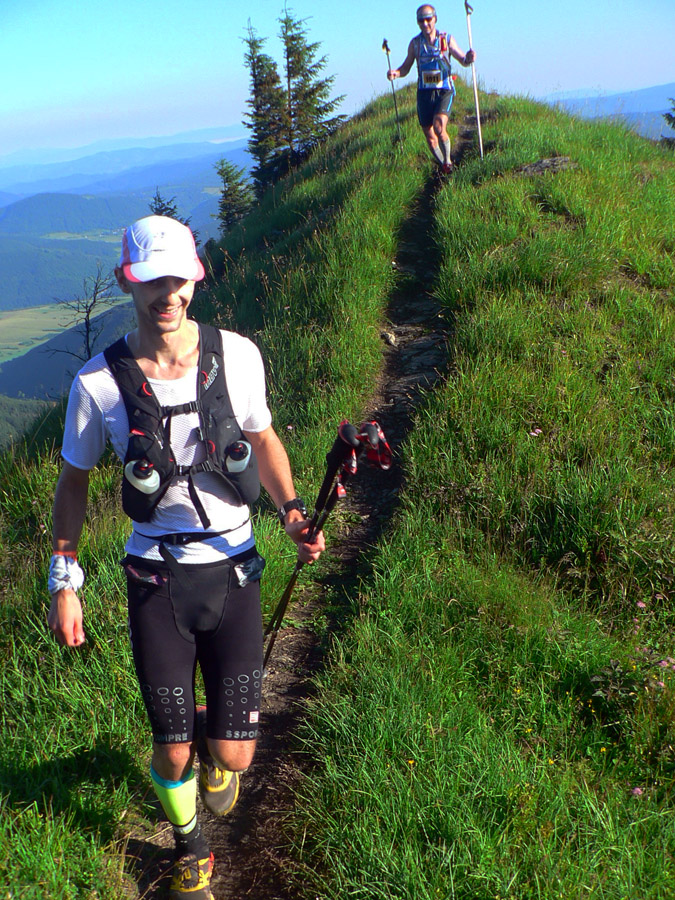 Dobieha prvá žena Peťa Mücková, tak ju chvíľu sprevádzam, pokecám, pofotím obláčiky nad kotlinou (už aj s občasnými závesmi dažďa) a od Veterného si idem svoje. A zas tá organizátorská zákernosť – aby sme neboli ani v druhej časti príliš ochudobnení o zážitky z brutálnych zbehov a výšľapov... Pekne priamo dole z hrebeňa do Kuneradu. To už sa dlhšiu dobu navzájom obiehame s Tónom Belianskym a nakoniec to spolu dotiahneme až na Kľak. Dodatočne veľká vďaka za hecung aj za spoločnosť, lebo si sa mi v cieli dáko stratil a nebolo príležitosti podať ti ruku.