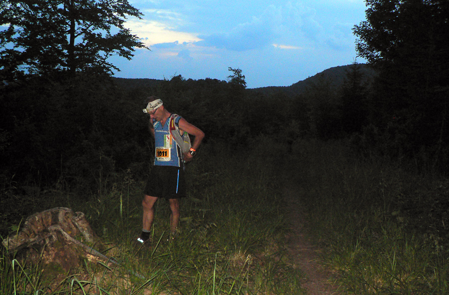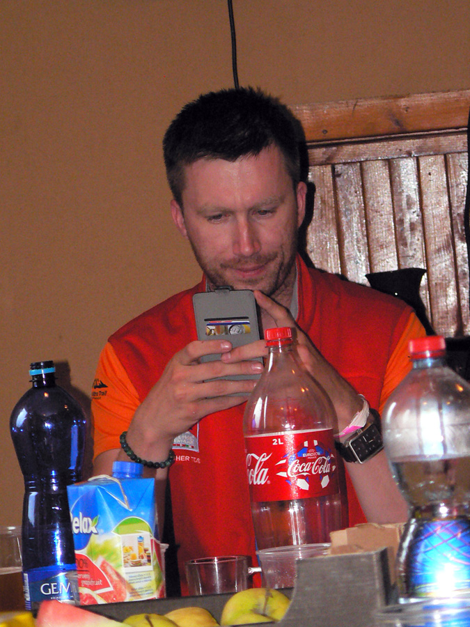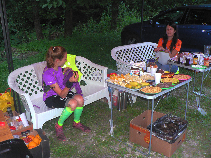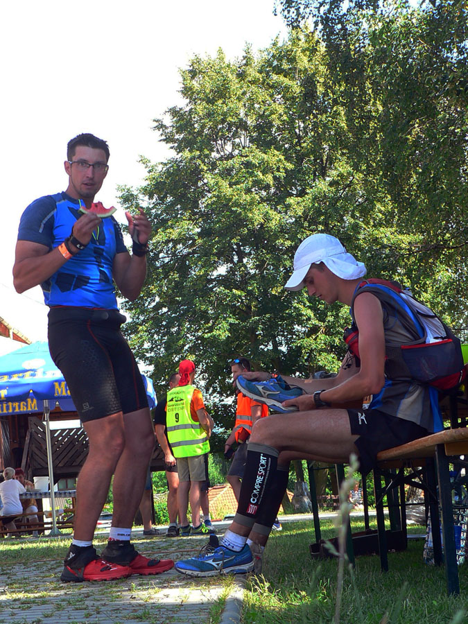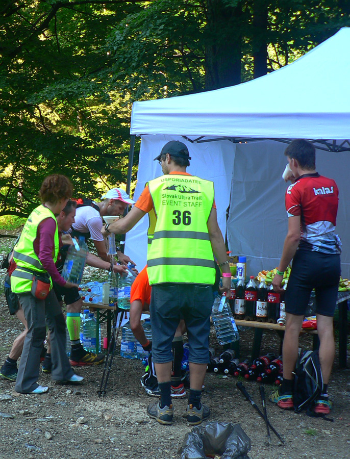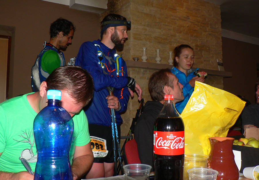 Na obžerstvovačke v Kunerade známy scenár: najprv 10 minút spamätávania sa, kým som schopný povedať, čo potrebujem. Hádžem do seba posledné chemické tromfy, ktoré mi majú pomôcť prežiť posledných šesť hodín, aspoň tak to vidím... Zaberajú a ešte viac asi fakt, že zas sa dorútila Peťa, samozrejme v dobrej nálade, a chvíľu za ňou ďalší dvaja chrti. Radšej idem. Dokopy odtiaľto odíde 25 stovkárov, kým sa kontrola dozvie, že ďalších už na trať pustiť nesmie...