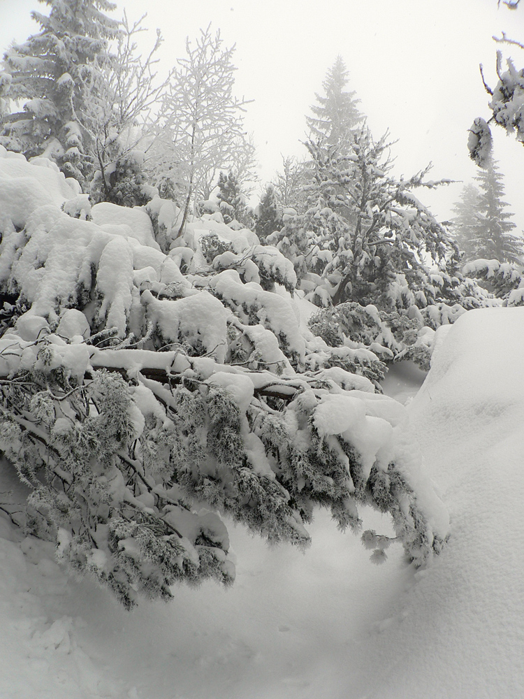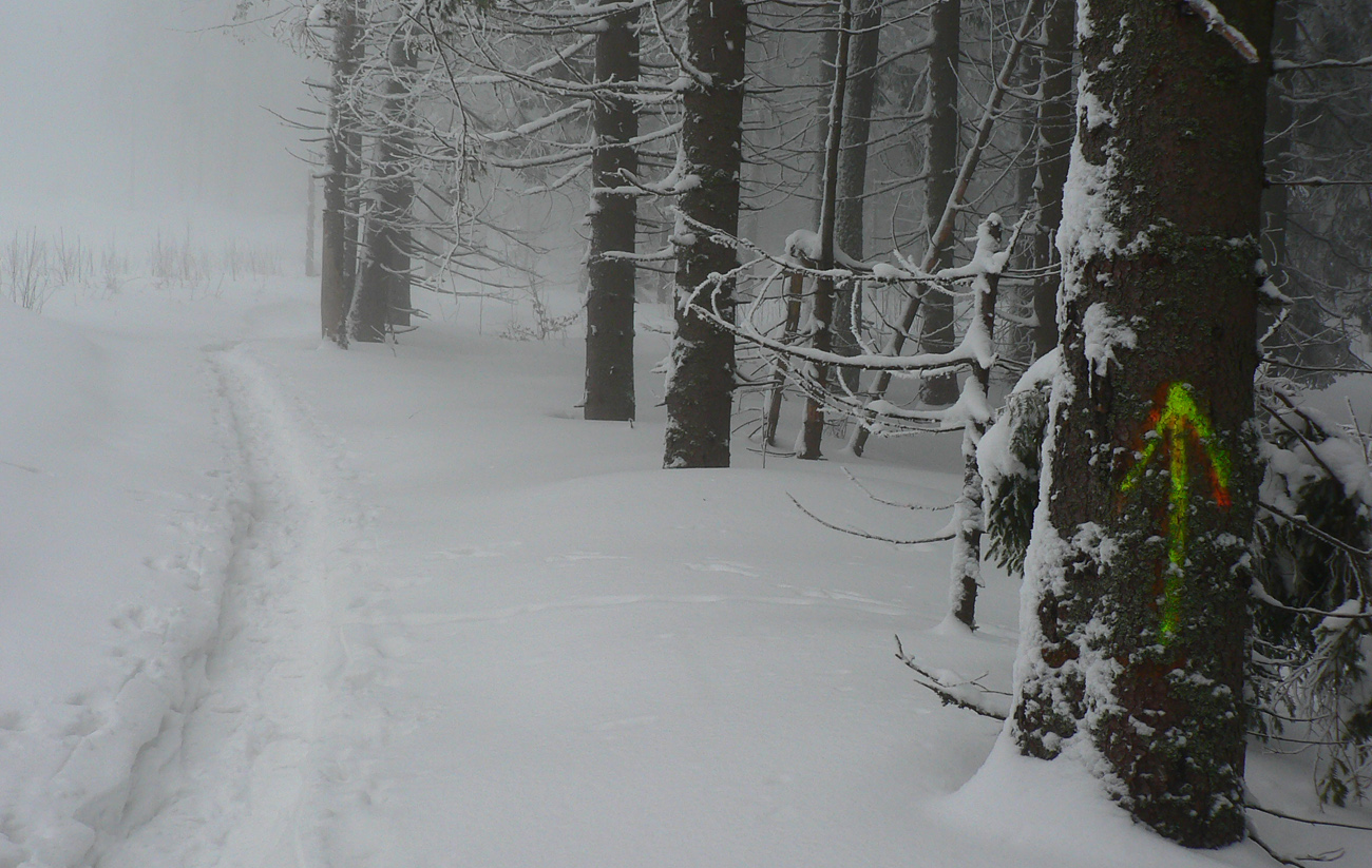 Hore nevidno ničovatô nič, tak cestou aspoň tyče obíjam, ale dáko ich je čoraz menej... Ale stôp požehnane, tak idem po nich. Intuitívne vnímam podľa sklonu terénu, kde asi som, ale že idem aj s tými stopami nejako moc prudko dole a že nejako priskoro som odbočil viac doprava, to mi dochádza, až keď vidím na strome pred sebou zelenú :-) Jáááj, ale do Brusna nechcem!!! Že bude viac stôp týmto smerom ako po hrebeňovke, to by mi veru nenapadlo.