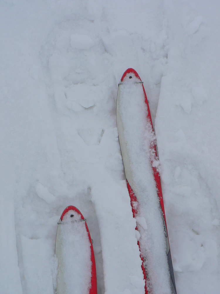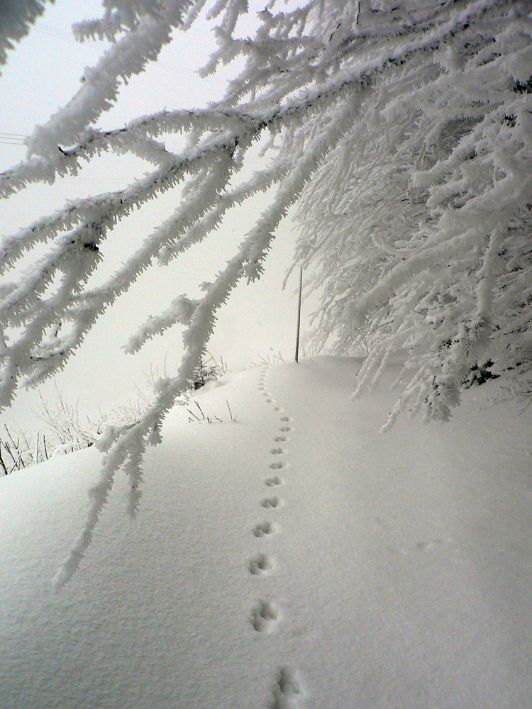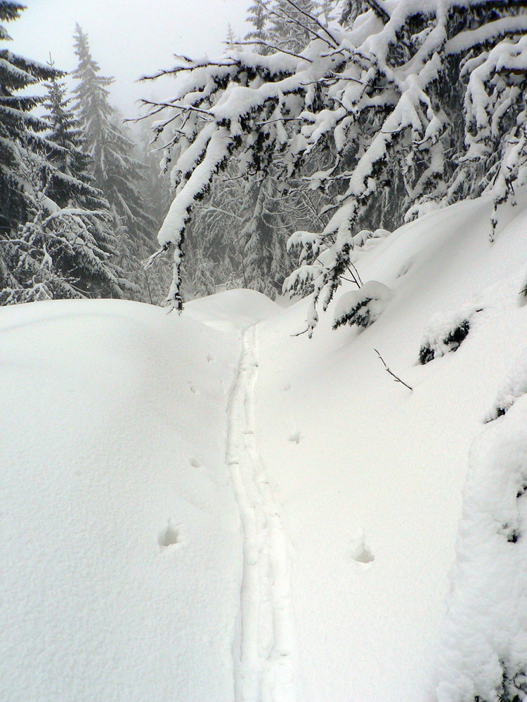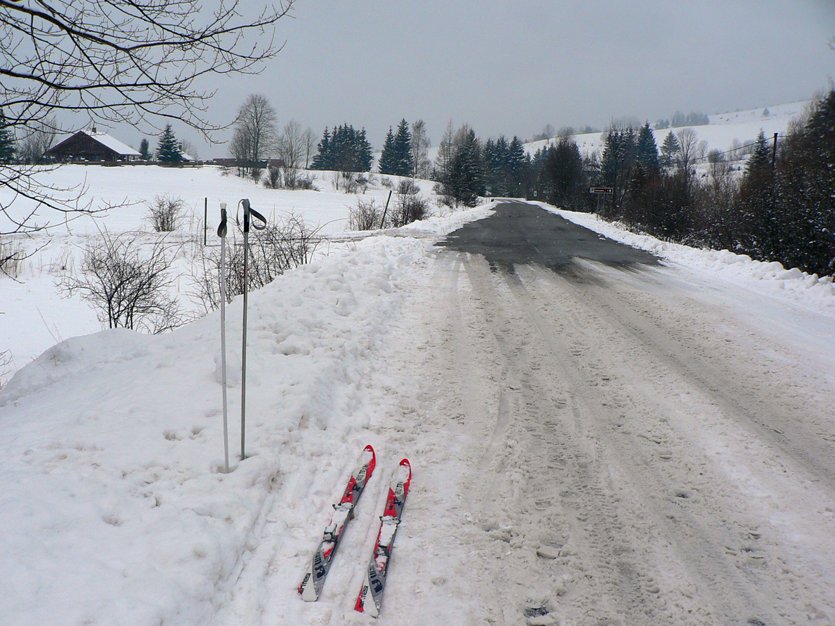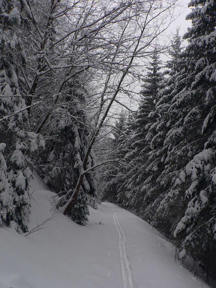 Od Košariska už je to komfort, tyče sú a hlavne: vidno od jednej k druhej :-) Pod Skalkou niekto lyžoval, zrazu mám aj pre lyže stopu, ale teším sa krátko. Spoza stromu najprv pes („Lidi nežere, jenom nechce uhýbat.“), potom päť borcov. Lebo idú na pešo a boria sa po kolená. Vraj sú zvyknutí... Ale ako tá stopa vyzerá... Našťastie kôrka drží, šmýkam povedľa. Spoločnosť mi robí jemný severáčik s arómou ružomberskej celulózky :-)
