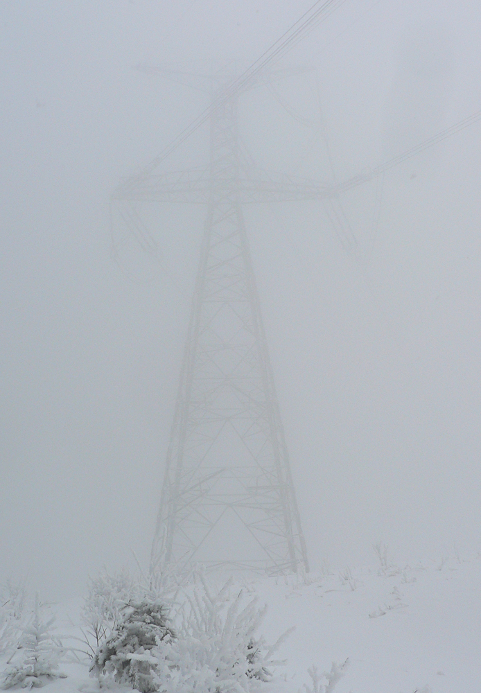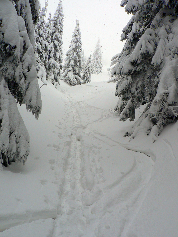 Tak prerážam. Do Hiadeľského sedla ešte po rovinke, to je rozcvička. Že sa blížim pod elektriku, spoznám podľa jej mohutného bzukotu. Zvláštny pocit... Potom strmina na Prašivú. Veľa nového snehu, cez týždeň zmäknutého a prisadnutého, na tom taká polotuhá kôrka a centimeter prášku. Presvitá aj staršia stopa, dole by sa celkom dobre oblúčikovalo, miesta je. Len na krátkom úseku na hrane lesa musím kosovku poriadne oklepať, aby sa dala podliezť. Obísť nejde. Potom zopár cik-cakov nad lesom: čerstvého snehu ubudlo, treba niekde do kôrky aj lyžou lepšie seknúť. Keď sa sklon zmierni, už je to pohodlnejšie, až k smerovníku na Prašivej.
