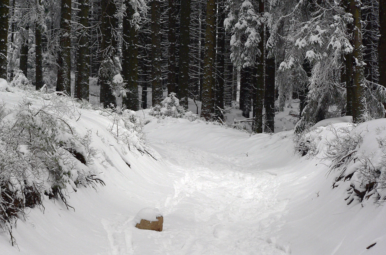 Ratrak aj dement uhli doprava, pokračujúce príjemné stúpanie na Štrosy mám vyznačené dvoma pármi snežníc. Prvý test orientácie na Kečke, ale tu sú tyče ešte nahusto. Snežničiarov dobieham pri vstupe do lesa, idú po žltej obchvatom, chodník cez Kozí chrbát ani nie je značený. Ďakujem im za stopu, frflú niečo po nemecky, tak sa tiež snažím o preklad. Pochopia, lebo po nemecky ďakujú, že teraz oni mne :-)
