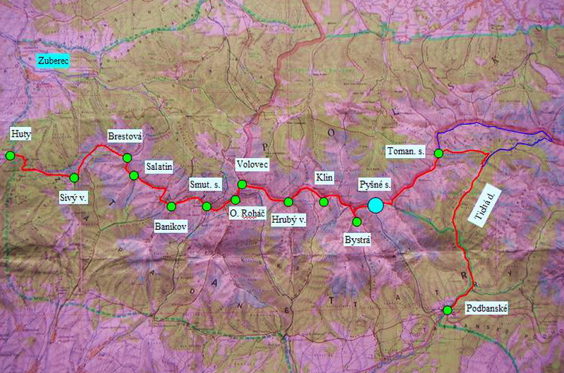 Plán trasy znel: Huty (východný koniec Západných Tatier), Sivý vrch, Brestová, Salatín, Spálená, Pachoľa, Baníkov, Smutné sedlo, Ostrý Roháč, Jamnické sedlo, Volovec, Hrubý vrch, Klin, Bystrá, Pyšné sedlo (kde nás bude čakať podporná skupina s vodou a sladkými i mastnými kalóriami), Veľká Kamenistá, Smrečiny, Tomanovské sedlo, Temniak, Kasprov vrch, Ľaliové sedlo (rozhranie medzi Západnými a Vysokými Tatrami), potom trochu späť a posledných 18 km dolu Tichou dolinou do Podbanského.