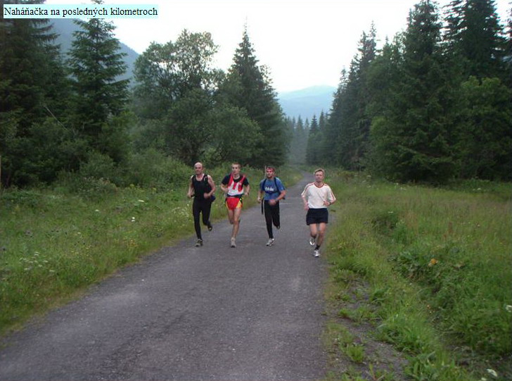Konečne je tu asfaltka. Už sme zasa dosť umorení a príliš sa nám nechce pokračovať bežne. Keď si ale na značke prečítame, že do Podbanského je to ešte tri a štvrť hodiny, a naše uťahané hlavy vykalkulujú, že tomu zodpovedá 17 km, niet vyhnutia a rozbiehame sa. (Našťastie sme sa mýlili, v skutočnosti to bolo len 11 km.) Po dvadsiatich minútach, čuduj sa svet, sa oproti nám objavuje bežec. Vtom Dudlimu zapne: to musí byť iste priateľ Roman Rybanský, ktorý dovolenkuje s rodinou v Račkovej doline a pozná náš pôvodný plán i časový odhad. Má šťastie, stačilo, aby vyrazil o čosi skôr a boli by sme sa minuli – a on by jachal až kamsi do Tramtárie na konci Tichej doliny.