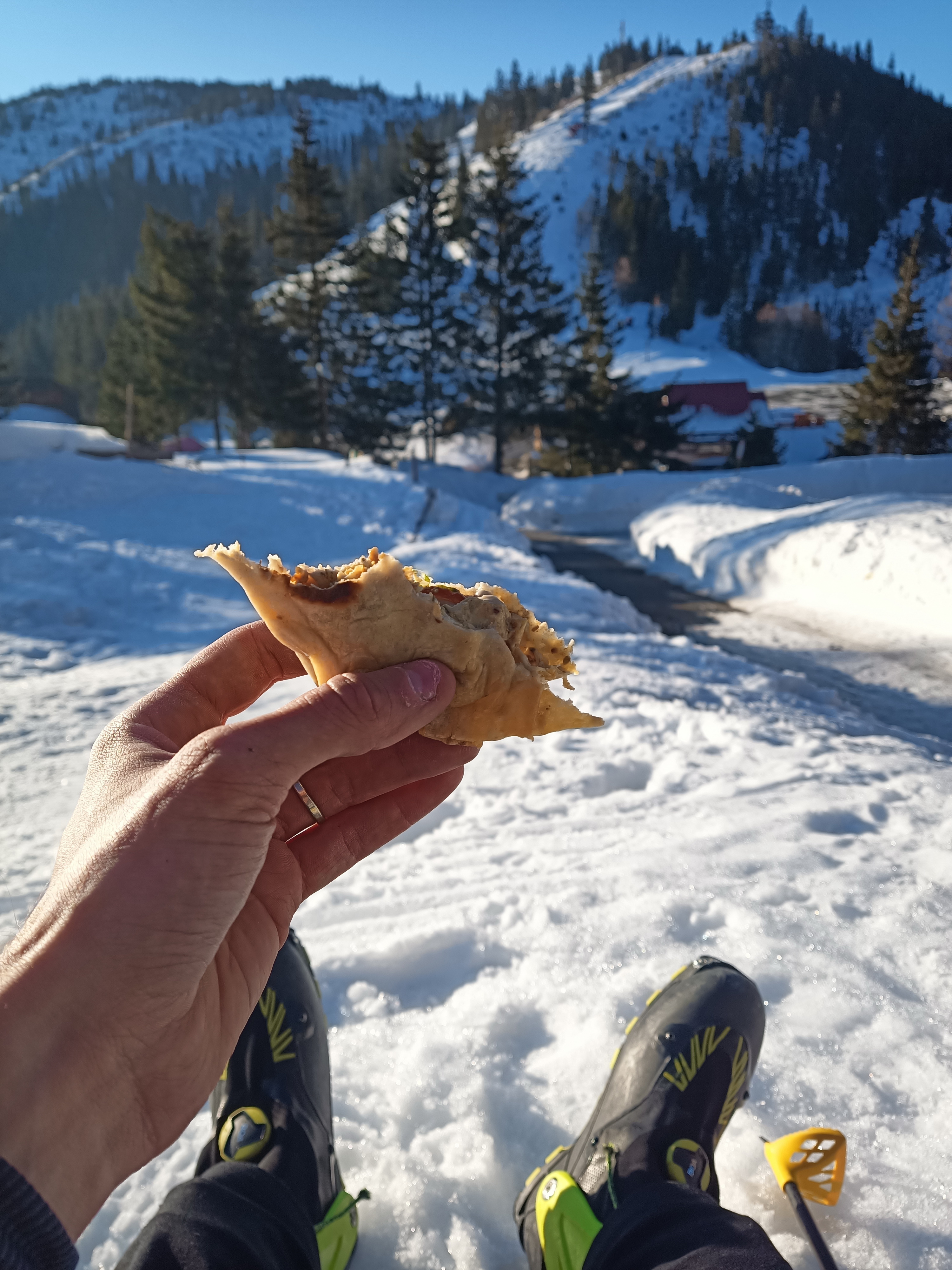 V Priehybe vyťahujem prvú tortilu s kuracím mäsom od polovičky Klaudie (čo by sme bez tých žien robili…), zajedám snickerskou, zapíjam ionťákom, ktorý začína byť v tom mraze riadne chladný, obúvam lyže a fučím hore, strmo na Kolesárovú. Slušný výšľap. Z Kolesárovej je hrebeň už menej jednoznačný, avšak po víkende ostala od zopár pešiakov slušná stopa aj v týchto častiach hrebeňa. Pomerne jednoducho prechádzam cez Oravcovú až na Zadnú Hoľu. Odtiaľ je hrebeň orientačne dosť náročný, avšak niektoré blbé miesta si pamätám avýrazne mi to uľahčuje aj prešliapaná stopa. Tesne za Havraňou poľanou je miesto, kde to treba strhnúť doprava. Viem, že takmer každý sa tu nechá zlákať a neodbočí. Aj prešliapnutá stopa navádza vľavo, ja si to tu našťastie pamätám z minulého roka, keď som tiež poblúdil, a triafam chodník hneď na prvýkrát. V týchto miestach je hrebeň ťažký pre pohyb na lyžiach: dole sa to pustiť nedá, na pásoch to ide ťažko, tak v niektorých miestach vyzúvam a idem pešo s lyžami v rukách. Vedel som, čo ma tu čaká, tak to zvládam pomerne rýchlo. Pred Ramžou opäť miesto, kde to prirodzene ťahá doľava, tento raz sa mi opäť podarí držať chodník a po chvíli som pri útulni Ramža. Je tesne pred východom slnka a ja konečne vypínam čelovku. Viem, že orientačne aj technicky najnáročnejší a úsek celého hrebeňa je za mnou. Kúsok oddychujem, niečo do seba natlačím a vyrážam smer Čertovica, kde mám v pláne dať si kávu a polievku. Okolo Bacúšskeho sedla sa mi prvýkrát ukazuje západná časť hrebeňa Nízkych Tatier s Ďumbierom, sľubujúca konečne aj nejaké výhľady. V Sedle za Lenivou sa napájam na bežkársku trať a poľahky sa púšťam na Čertovicu.