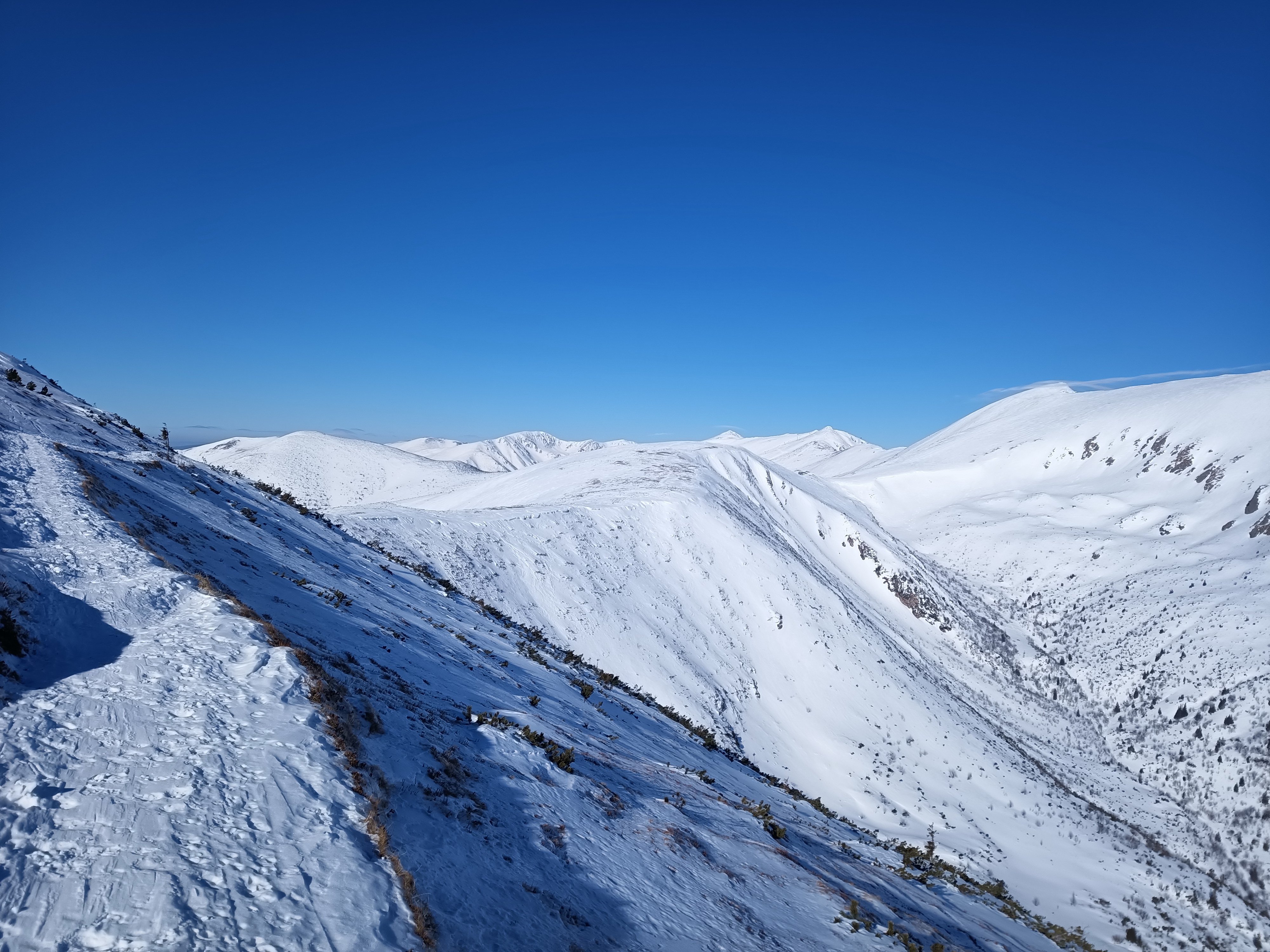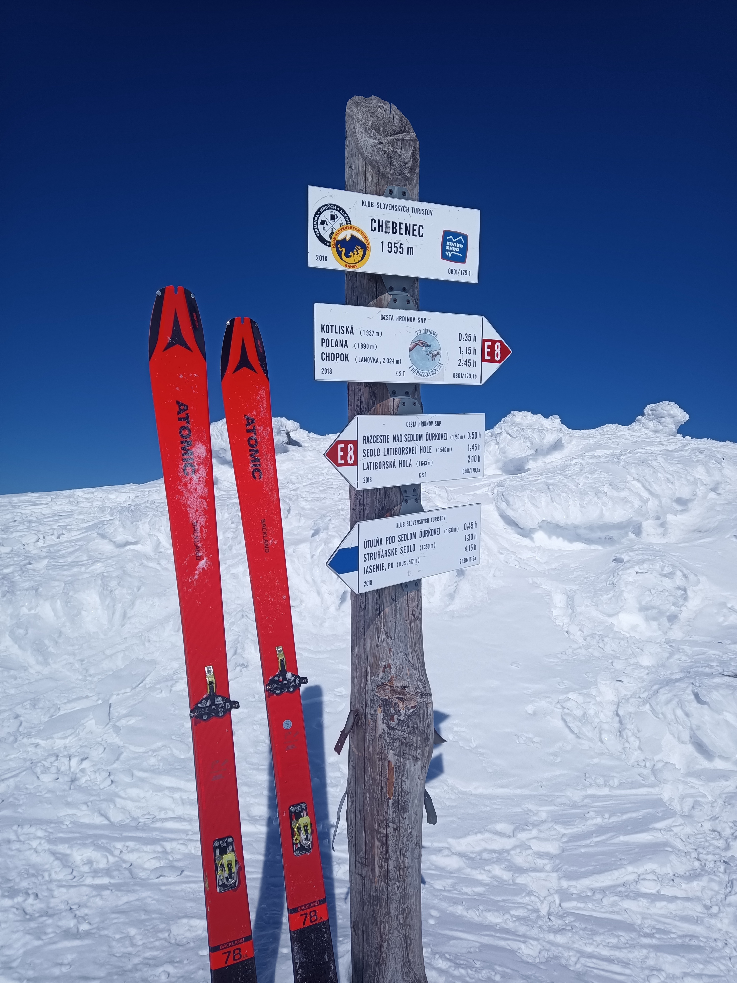 Na chate konečne teplá polievka, teplý čaj a veľká káva. Obúvam suché ponožky, trochu sa ponaťahujem a vyrážam smer Ďumbier. Ľudí tu vzhľadom na pondelok nie je veľa, ale po západnej časti hrebeňa je to aj tak sociálny šok. Na vrchole sa nezdržiavam, pokochám sa výhľadmi, strhávam pásy a lyžujem smer Demänovské sedlo. Sneh je tu zmrznutý, rozbity, kde tu trčí kameň. Lyžovačka veru dnes nie je veľmi o užívaní si. V sedle lepím pásy a pokračujem smer Chopok. Na Chopku len prefrčím okolo hornej stanice lanovky a púšťam to pod Dereše. Z Derešov krásnym hrebeňom pohodovo na Poľanu a konečne opäť v kľude bez ľudí. Až na ten vietor, ktorý ešte výrazne zosilnel, zalieza už takmer všade a ja začínam byť dosť premrznutý. Rozhodne to nepridáva na pohode. Hrebeň ďalej pokračuje krásnym úsekom cez Kotliská. Opäť rýchlo striedam výšľapy na pásoch a lyžovanie. Pod krátkym, ale výživným výstupom na Chebenec sa mi darí nájsť kúsok závetria za skalou, tak oddychujem. Totálne premrznutý a vyfúkaný volám manželke, na Popradskom plese vraj počasie na krátke tričko. No super. V telefóne mi hovorí, že z Chabenca to už nemám ďaleko a ja som jej naivne uveril – sladká nevedomosť. Posilnený touto info cikcakujem na Chabenec.