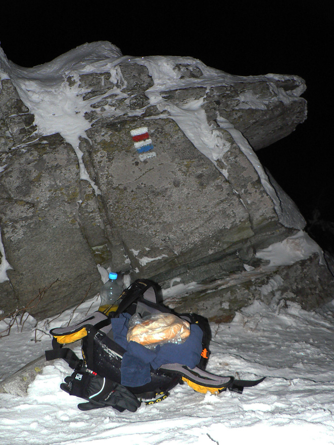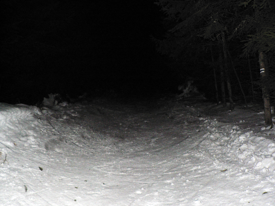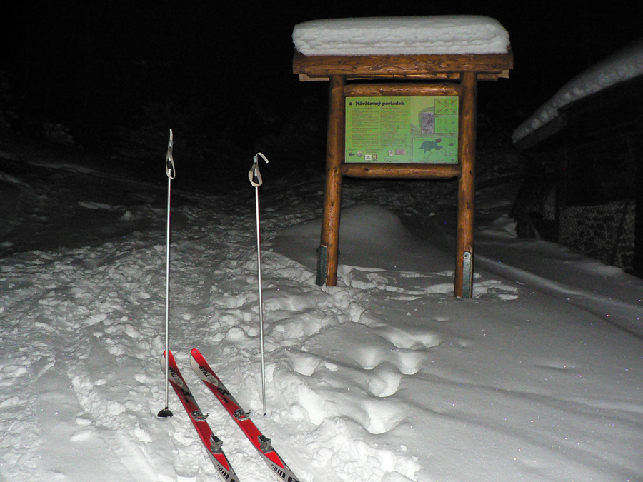 Šumiac 00:00 Naopak prípoj do Telgártu ku koncu cesty trocha mešká, je to posledný spoj a celkom dosť ľudí vezie. Nakoniec štartujem zo Šumiaca – čítal som, že na červenej z Telgártu na viacerých miestach ešte zavadzia májová veterná kalamita. Lyže zapínam na začiatku chodníka presne o polnoci, aspoň sa to bude dobre počítať :-) Áno, vedome sa chystám porušiť návštevný poriadok, ale v tomto prípade túžba víťazí nad zodpovednosťou. Hádam tej prírode až tak nezvratne neublížim. Prípadnú pokutu zahrniem do nutných nákladov.