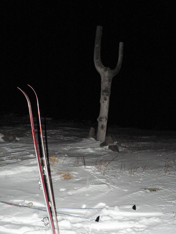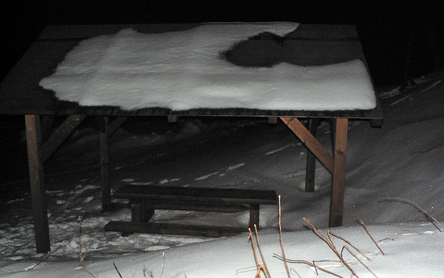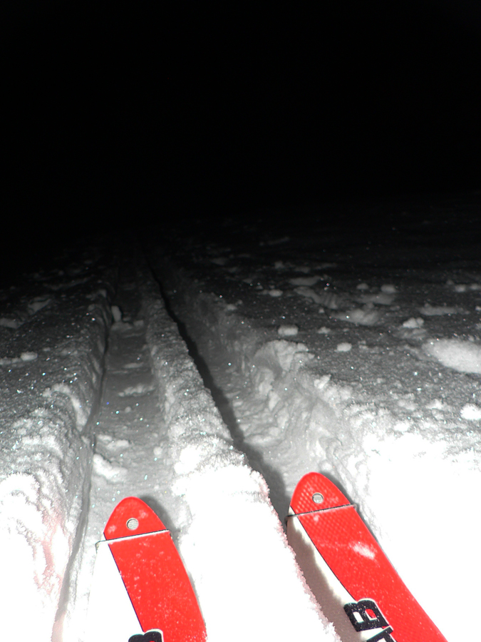 Kráľova hoľa 1:30 Chodník je vyleštený, nižšie chrapčí pod lyžami zmrznutý firn, vyššie vrždí ulyžovaný prašan, v lese to vyzerá ako v snehovom raji, ale to len akože – žiadny základ, len jedna „kalamitná vrstva“ a kamene trčia. Nad lesom musím miestami hľadať cestu pomedzi trávu a balvany – tam kde nie je sneh udupaný, slnko a vietor vylízali južné svahy. Ale to je všade – ak nepripadne, táto zima rýchlo skončí po prvých dažďoch. Hore fúka taký mierny, ale štipľavý z JZ. Nevadí, osviežuje a v ľavom uchu mi hvízda meluzína :-) Stopa je viditeľná, čelovku na minimum a ide sa. Krásna, tichá, jasná hviezdnatá noc a padajú hviezdy! V dolinách naľavo – napravo oranžové mapy nočných dedín a miest. Pod nohami „šindľový sneh“ všetkých foriem, tak ako ho vyfúkalo do vzoriek. Na svahoch pevná krusta, väčšinou rovná, zatiaľ v pohode. Lyžovačka dolu z Bartkovej celkom fajn (čelovku naplno), aj trocha prašanu sa nájde medzi stromami.