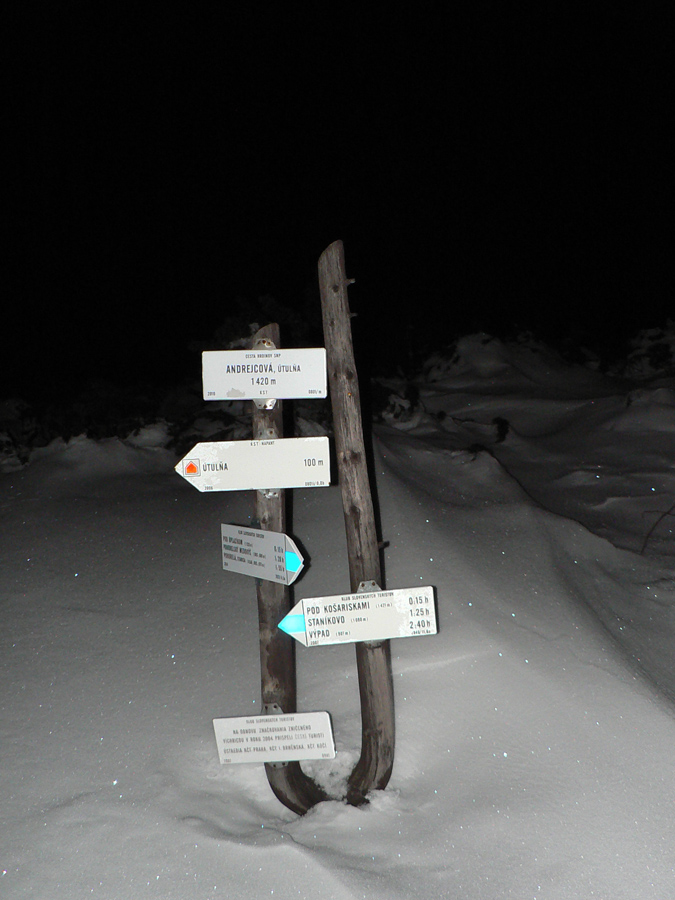 Ždiarske sedlo 2:30 Odtiaľto je to celkom iná lyžovačka – posúvanie v presne narysovanej hlbokej stope širokým lesným priesekom, v tichu, bez vetra. Sneh iskrí ako posypaný diamantmi, nad hlavou iskria hviezdy, krása. Len sem – tam sa pozriem okolo, kedy miniem útulňu na Andrejcovej, zatiaľ nič. Začínam stúpať dajakým polomom. Podľa času by to mal byť začiatok stúpania na Priehybku, ale veď tu bol dobrý chodník v lete??? A tá koliba tu bola? Nad lesom prvé čo ma zarazí, prečo fúka od severu, keď doteraz z juhu? Aj známe „oranžové mapy“ veľkých horehronských dedín sú na opačnej strane, to čo? Štartujem GPS - ukazuje, že som na červenej, nezablúdil som, ale stúpam zas na Bartkovú! Tak toto nechápem, kde som sa na rovnej stope mohol otočiť o 180 stupňov :-) Až keď druhý raz prechádzam okolo smerovníka v Ždiarskom sedle, zisťujem pravdepodobnú príčinu. Tesne nad klesaním k útulni asi tí, čo naťahovali stopu, mierne zmätkovali a spravili okruh smerom na juh, vrátiac sa nazad na červenú, a ja za nimi. Lenže oni pri napojení na chodník išli správne doľava a ja, mysliac si, že len vchádzam na širšiu stopu, doprava, čiže nazad :-) No a čo? Aspoň to celé bude mať viac ako 100km, super nie? :-)