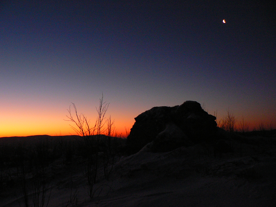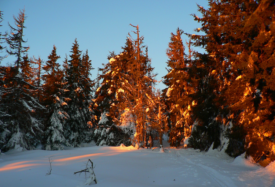 Priehyba 5:50 Po „pristátí“ v sedle zrazu začujem spod stromu zlostné mrmľanie. Žiadny medveď! Len som škrabotom lyží po kruste zobudil partiu, ktorá si užíva hrebeň na snežniciach. Ospravedlňujem sa a odtiahnem kus nabok, naliepam a „teším sa“ na strmák za cestou. Na rozdiel od Stíhačky dnes mi dajako nechutí. Že by to bolo tým, že sa tu teraz nedá najesť? :-) Vyššie nad lesom ma zastihuje svitanie, nádherné, žlto – oranžové. O kus ďalej, v stúpaní riedkym lesom na Kolesárovú, otvára sa pohľad na ranné Tatry.