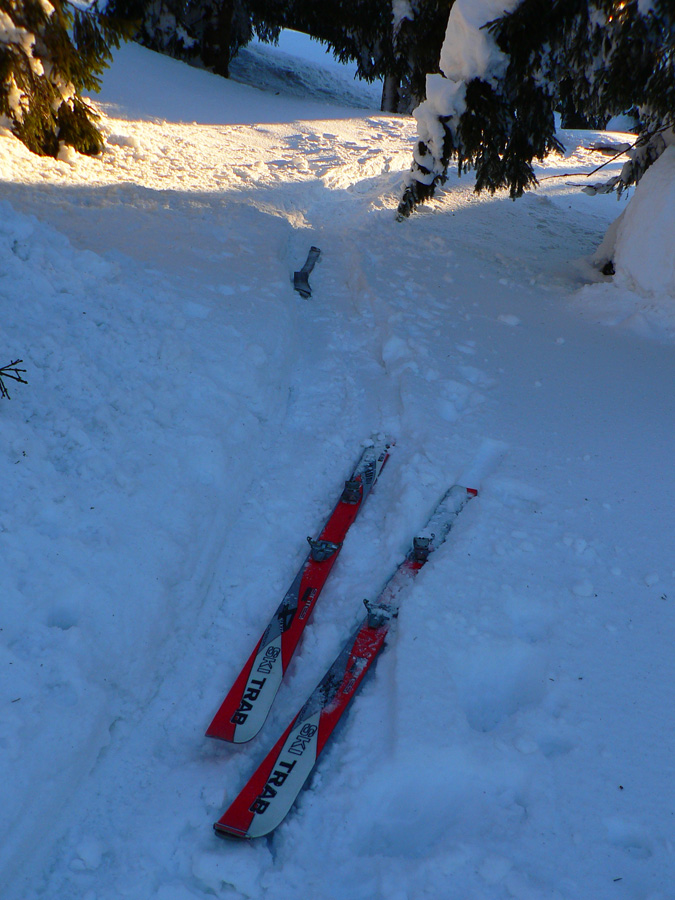 Zadná hoľa 7:50 Hodina kráčania stačila, odliepam koberce a snažím sa aj o nejaké oblúky lesom dole z Homôľky. Ale snehu málo, veľa vývratov a konárov trčí, pomedzi kosovku sa tiež zle kľučkuje, ešte zo meter na dobrú lyžovačku by to chcelo.