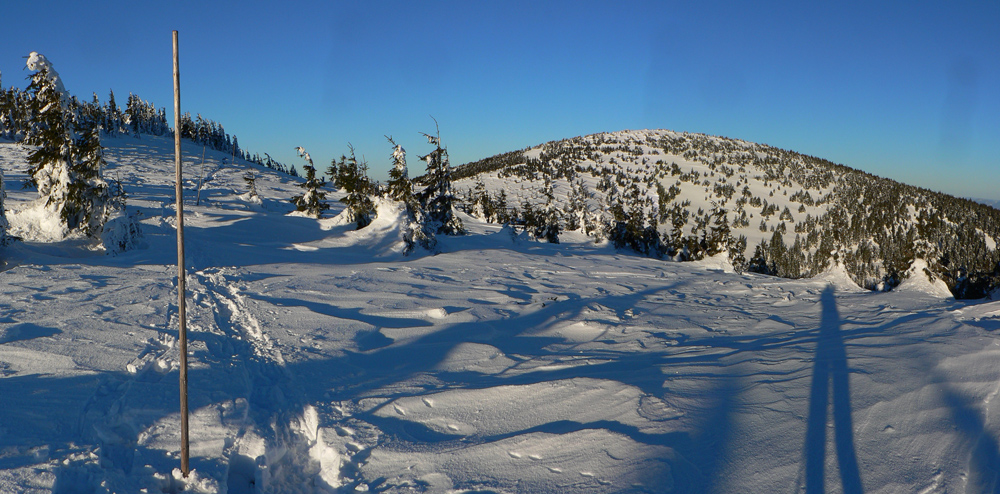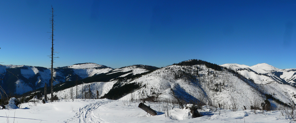 Ramža 9:30 Je čas na desiatu. Využívam slnko, ktoré hreje akurát tak, že mu môžem nastaviť chrbát, ale sneh pod pásmi ešte nie je mokrý. O chvíľu ďalej: z Jánovho grúňa sa otvára výhľad na panorámu „mesačnej krajiny“, ktorá je v bielo-čiernej zimnej kombinácii oveľa výraznejšia ako v lete. Na rúbaniskách, vystavených slnku, už sneh trocha namoká. Prvých ľudí od rána (ak nerátam spáčov v Priehybe) stretám až v Sedle za Lenivou, čo sa dosť divím, keď je tak pekne.