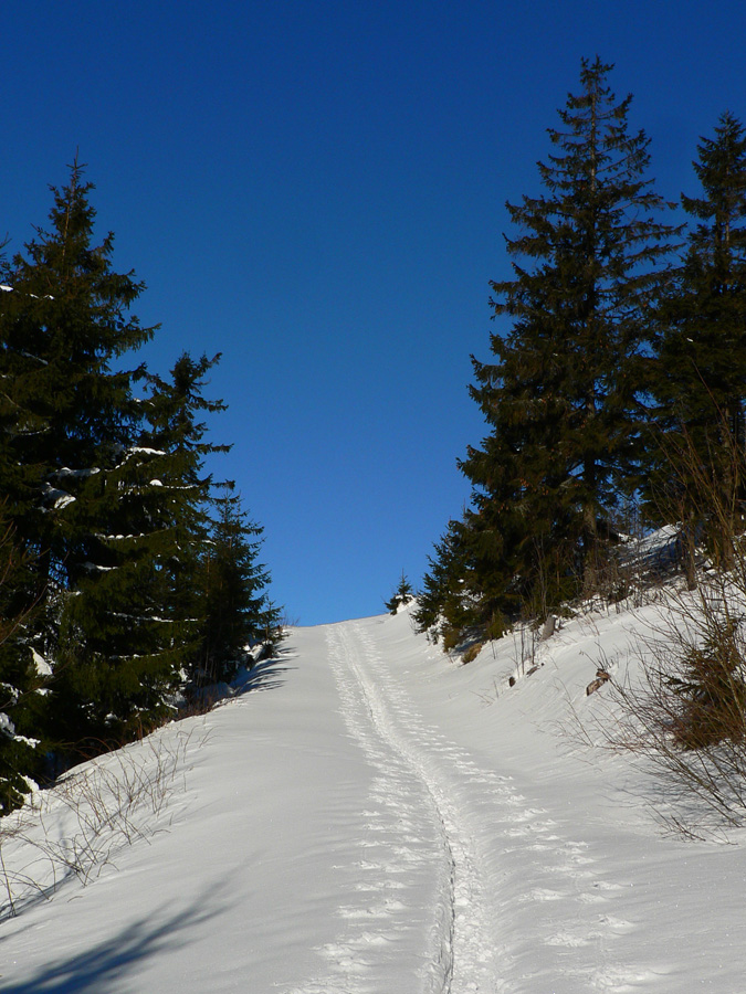 Hiadeľské sedlo 21:30 Nakoniec som akosi prežil aj ten posledný zjazd. Nad lesom to nakoniec bolo celkom pohodlné - po zmrznutej síce, ale nie ľadovo klzkej kôre. V lese už o dosť horšie, striedanie závejov sypkého snehu, tenkej odpornej krusty a ľadu, napadaného zo stromov. Aj som na chvíľu špekuloval, či to radšej nezbehnúť s lyžami na chrbte, ale otlačené chodidlá v značnom štádiu rozpadu ma odradili. Dole v sedle som s vďakou odmietol lákanie odrazky pod lesom, ktorá ma vyzývala pokračovať po červenej cez Kozí chrbát. Mal som dojem, že ani chodník nie je prešliapaný, ale aj tu pri predstave pešovania hore kopcom s lyžami na batohu posledné slovo mali otlaky. Traverzom po žltej to bolo o dosť príjemnejšie, stopa prechodená. O tom, že meliem z predposledných síl, svedčili zas pocity - o nekonečnosti a strmosti lúk medzi Hadľankou a Kečkou, ktoré inak považujem za príjemnú prechádzku. Takéto pocity som mal naposledy pri prvej Stíhačke. Ale potom už len zošup na Špongu, posledné malé stúpania lesom a už sa veziem po lyžiarskej ceste v ústrety cieľu.