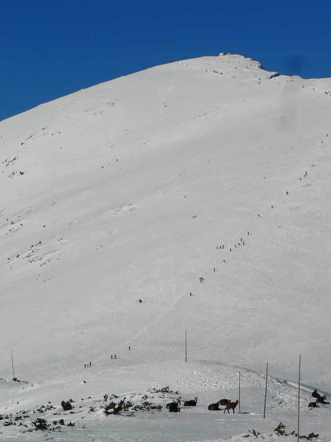 Čertovica 11:00 No myslel som si, že sem prídem skôr. Blúdenie a „koberce“ za to môžu len čiastočne. Je tu na môj vkus príliš živo, tak ani nestojím - len lyže do rúk, cez cestu a ide sa ďalej. Vlek pod Lajštrochom neťahá, tak môžem využiť tvrdú a rovnú zjazdovku – trocha pomoc na tej úvodnej strmine. Dáko sa mi zle stúpa, žeby už únava? Ani Králička do kopca mi nejako nechutí, žeby to bolo tým vetrom, čo dajako silnie? To už nie sú predpovedané nárazy do 10m/s, to už je slušný víchor. A just z JZ, čiastočne oproti a začína ma to fest brzdiť. Už viem, že celá sranda bude dlhšie trvať, ako som plánoval, treba šetriť jedlo. Ale aj dáku vzpruhu treba. Takže na Štefáničke velím: veľkú kofolu a dve horalky prosím, na stojáka :-) Pomáha a na Ďumbier (aj s podporou vetra) to už celkom ide.