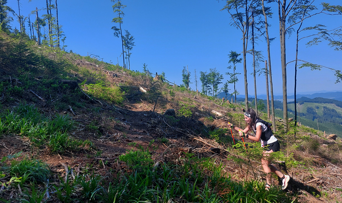 Potom miernejšie zvážnice medzi sedlami Rakytie a Javorina, až ku prvej kontrole, a ďalšia strmina. Hrebeň pekný, ale predtým, pod ním, hrôza rúbanísk – a to ešte nedávno aký krásny les tam bol!