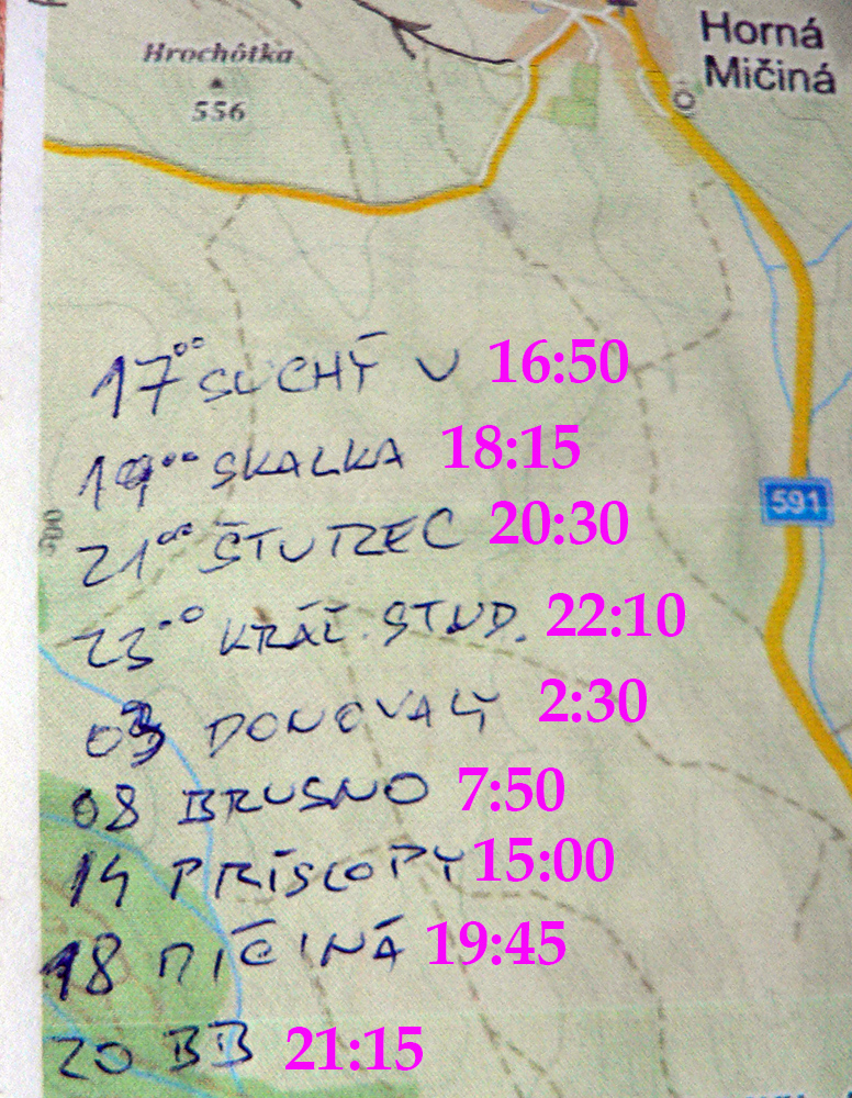 Ale sranda, že od Hrochote sa mi akosi lepšie beží. Vynára sa spomienka, ako Maťa Fabšíka zachránili na UTMB vareným vínom ( 2012 ). Že by som začal chľastať? Alebo je to tou búrkou, ktorá ma naháňa? Dohnala ma za Oravcami: lejak je fajn, blesky nie veľmi. Posedím si chvíľu na terase poľovníckej chaty a davaj dole, do Hornej Mičinej. Zas už kvalitne čvachtám, maratónky už asi piaty raz opraté, poriadne cítim rozmočené chodidlá. Ale už viem, že to dám, aj chromý.
