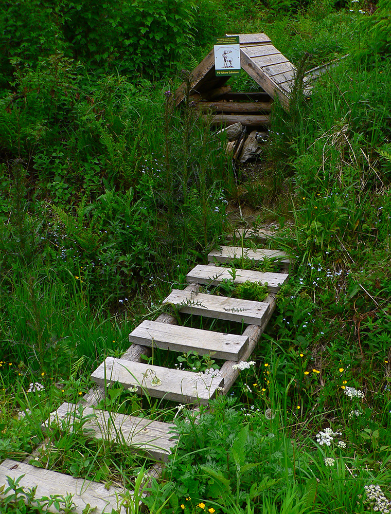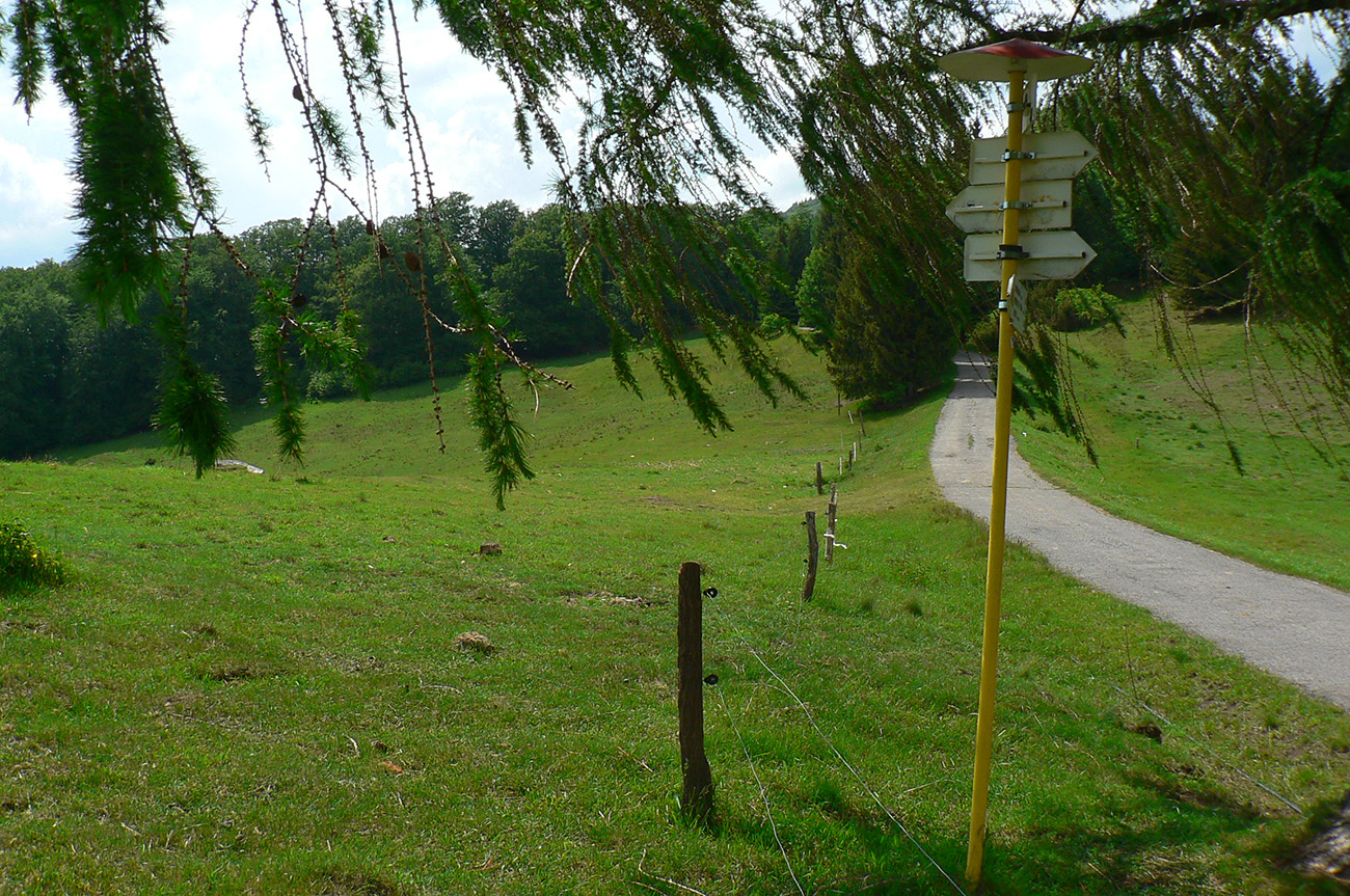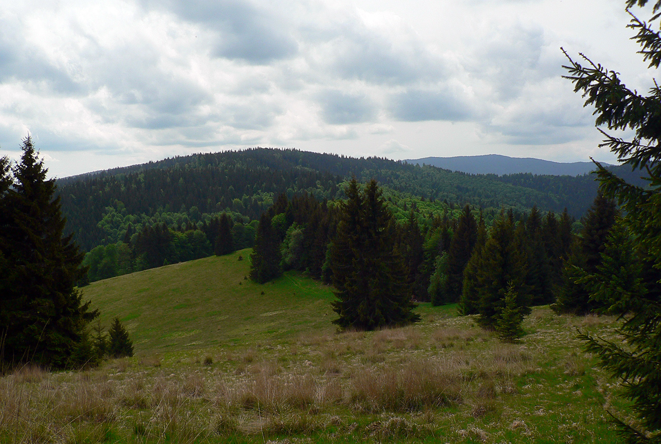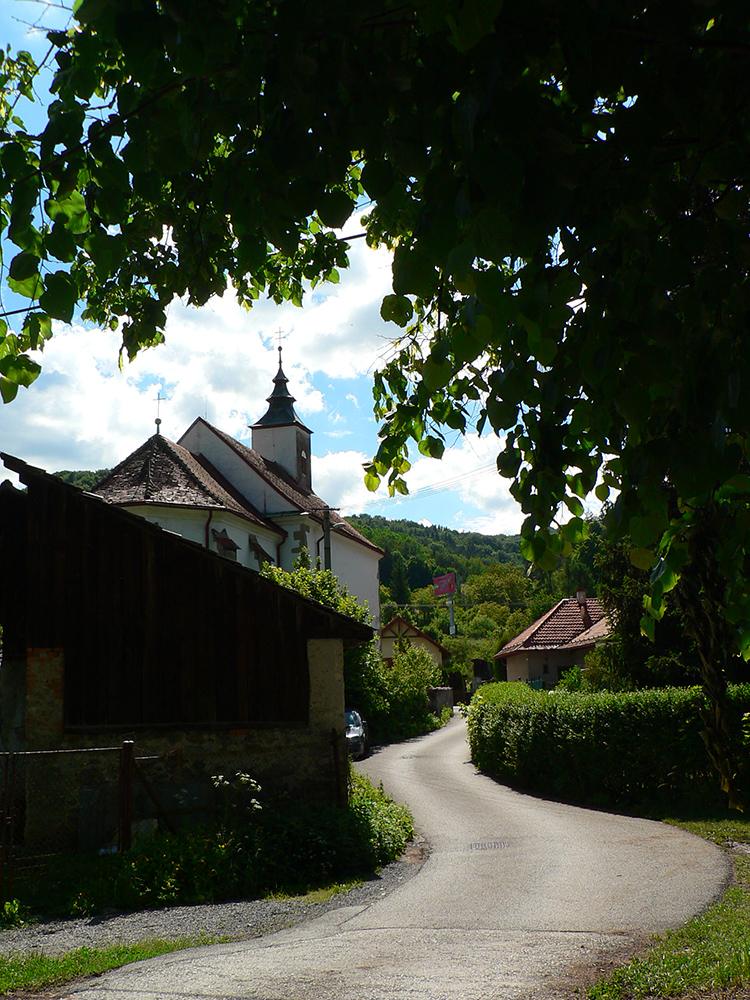 Cez Jakub popri kostole a už stúpam na Laskomer. A vôbec mi to nechutí. Hovorím si, že to bude tým teplom bez vetra a popoludňajším útlmom, ktorý ma vždy o takomto čase chytá. Laskomer je inak jediný kopec, cez ktorého vrchol sa nedá - kvôli veľkému areálu vysielača. Tak to aspoň ťahám popri plote. Pri zbehu do Laskomerskej doliny plaším poriadneho jeleňa – len metre od najbližších domov, sranda. Potom už „váľov“ v Podlaviciach, ktorý smädného a prehriateho nikdy nesklame. Ani tá krčma hneď vedľa ma neláka. Tankujem už plnú a cez Skubín v ústrety (dúfam, že posledným dnešným) vyhriatym lúkam stúpam pod Suchý vrch.