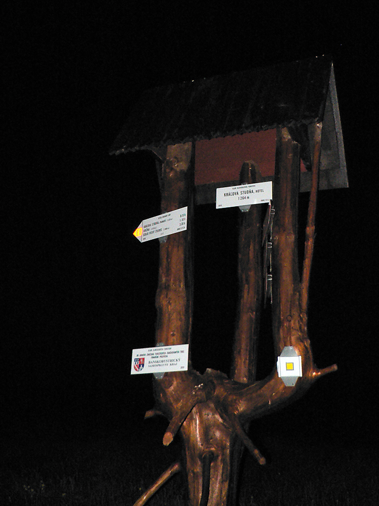 Na Šturci som o pol deviatej, pol hodinu pred plánom, tak len krátka pauza na niečo malé a sladké, hlásenie domov že žijem a bez čelovky klusám až na Kráľovu studňu. Monotónna temnejúca zvážnica, dlhá 1,5 hodiny, na jej konci krčma. Veranda ešte žije, ale už nečapujú - a sakra! Prvý a posledný raz vyťahujem fukerku, prievan cez hrebeň Krížnej viem čo dokáže. A na beh už sily nestačia, ani náhodou. Aspoň rozhľady si ešte dokážem trochu užívať, takže to ešte nie je také zlé: vľavo vysvietený MT, vpravo vysvietená BB. Predo mnou dve červené oči, ktoré ale nie a nie sa priblížiť. Jedno z prvých malých nekonečien na tomto výlete.