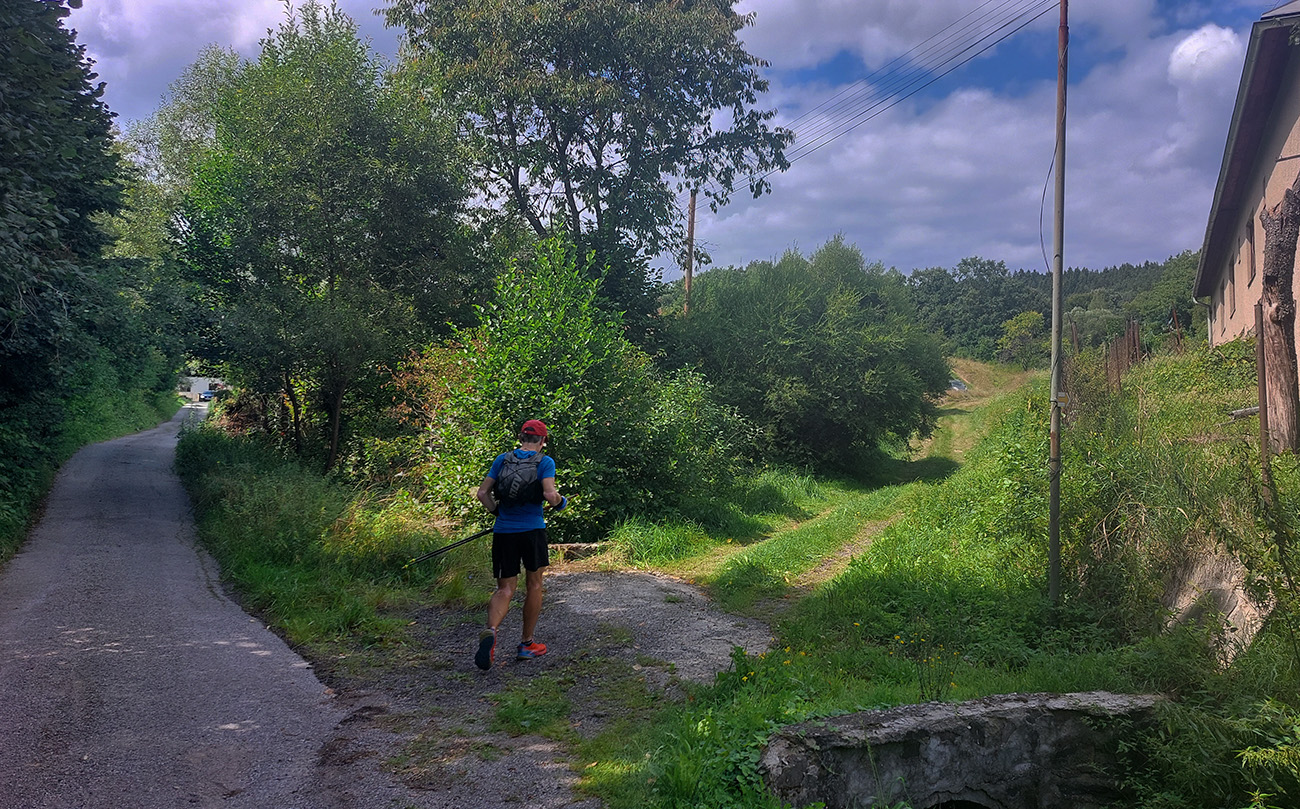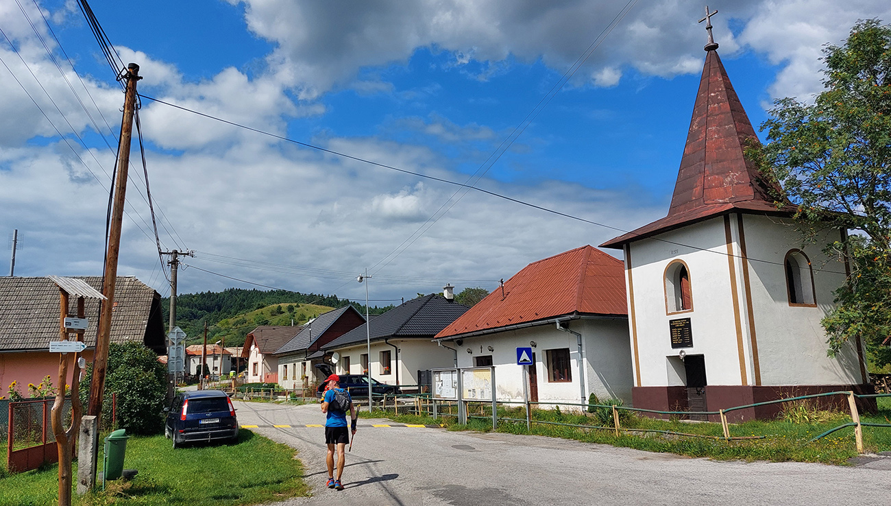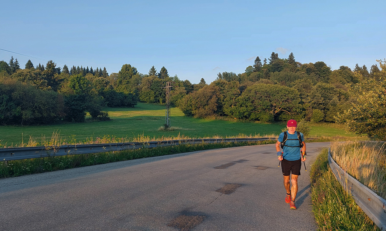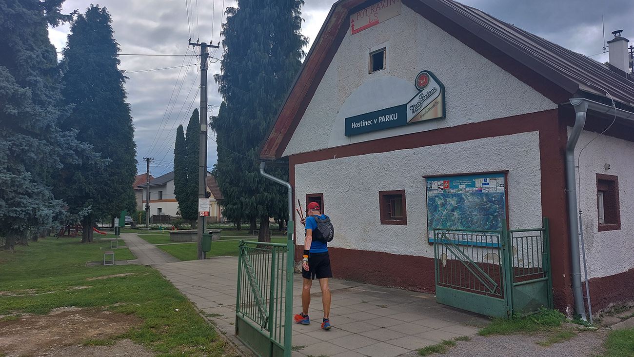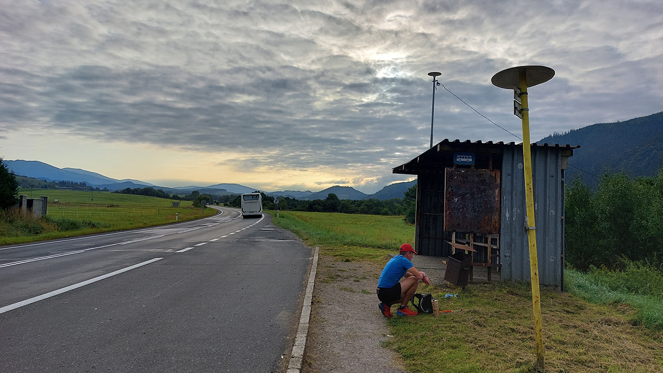 Pretože času sme mali stále doooosť a dole na vlak sme nesmeli pribehnúť zas príliš skoro, aby sme neklepali kosu na peróne, dovolili sme si ďalšiu kofču na slnkom vyhriatej terase. Predsa len, takto pred siedmou už sa vonku (aj keď na slnku) schyľovalo k jeseni, ako sa slnko schyľovalo k západu. A potom už dlhý zbeh na Krahule. Dosť proti slnku síce, ale mierny, teda celkovo v pohode. Lesmi, lúkami, dole krížom cez zjazdovky. Zaspomínal som si, kde som tu na lavičke raňajkoval takto pred štyrmi rokmi počas Koruny Turca . Dole v dedine nevkusné milionárske haciendy a bľakot karaoke – perfektné prostredie pre relax v lone prírody, ako si ho niektorí predstavujú. Pre nás ale hlavne začala posledná asfaltérčina smerom do stredu Európy. Cesta široká, len tým besným esúvéčkam sa bolo treba radšej uhýbať, oni proste musia ukazovať, akí sú páni všetkého.