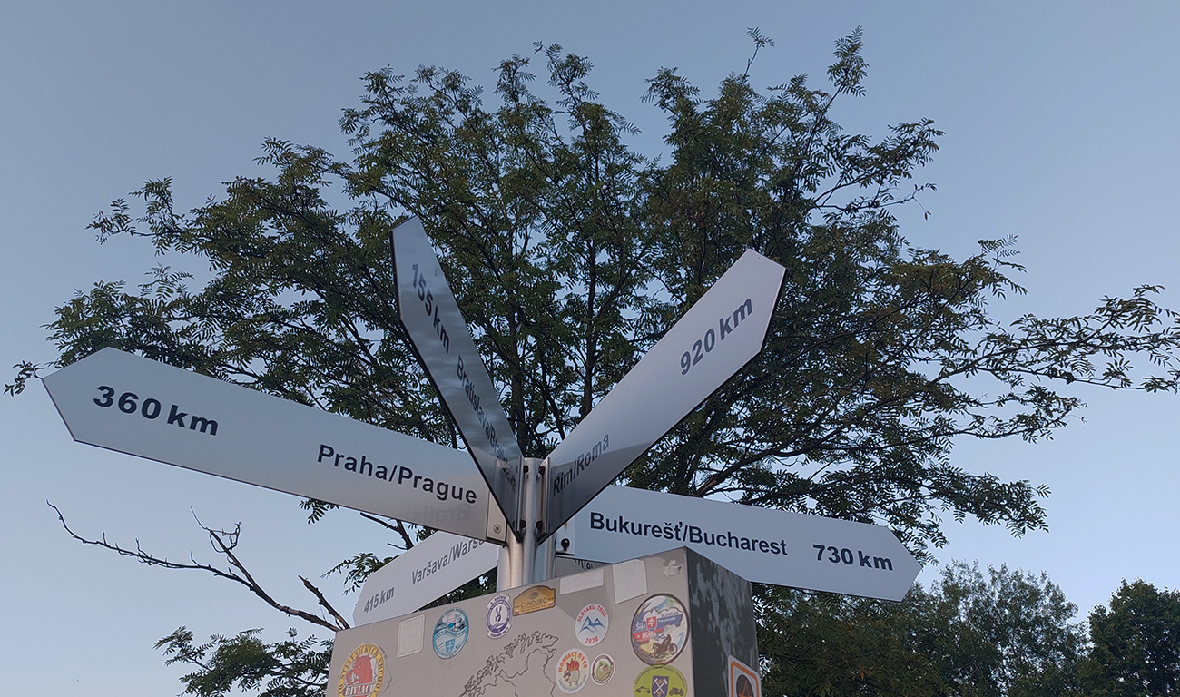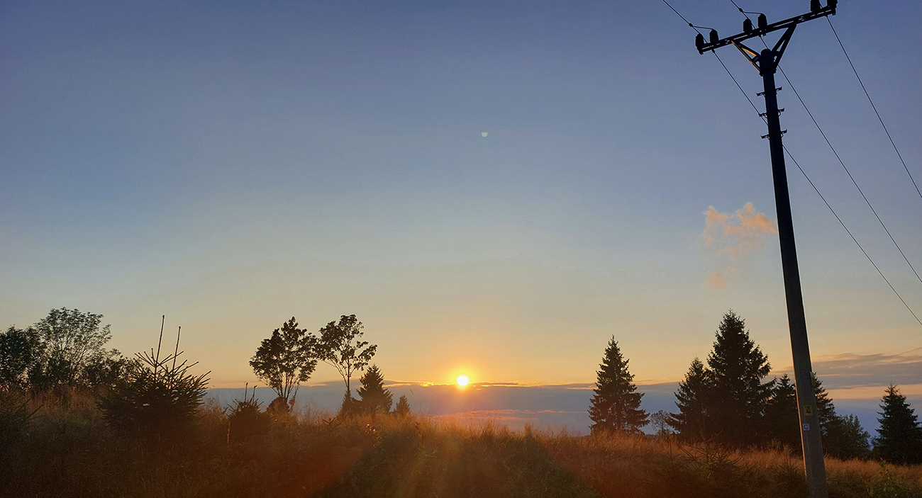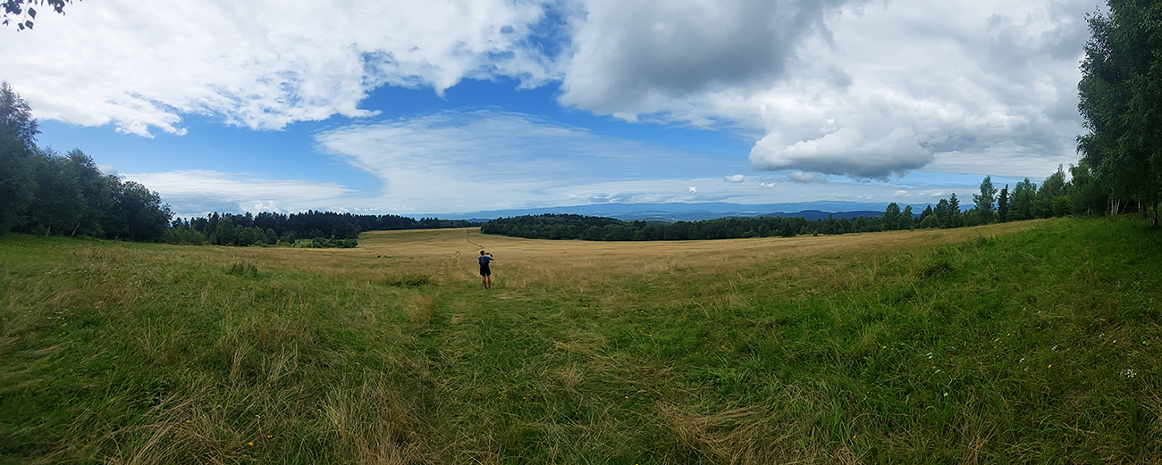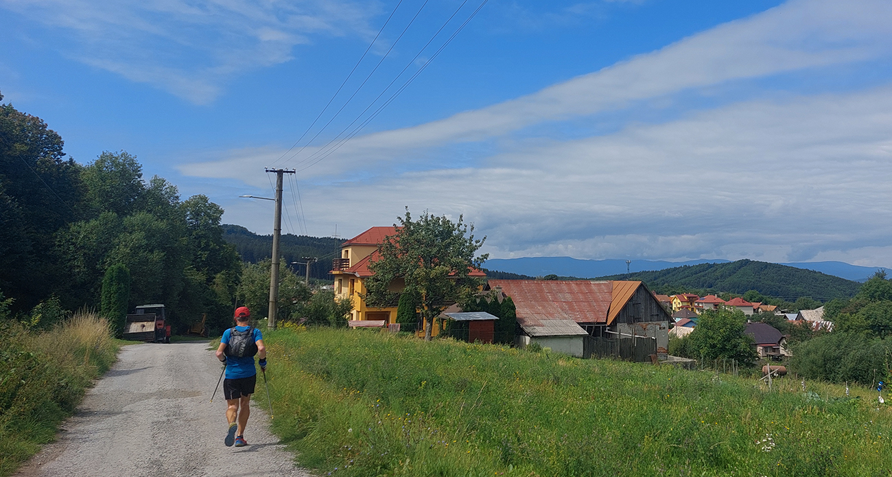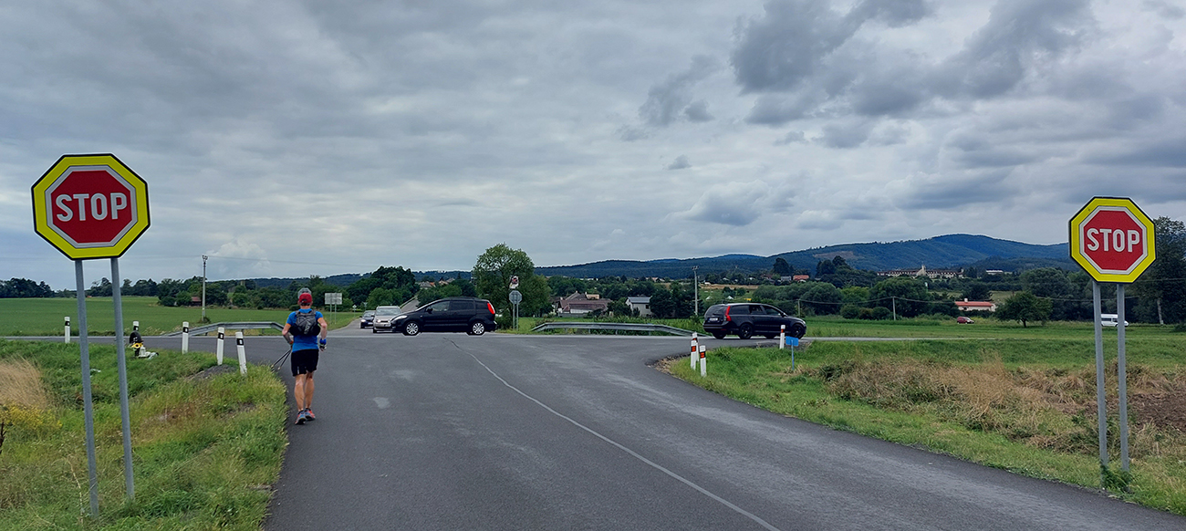 Pretože času sme mali stále doooosť a dole na vlak sme nesmeli pribehnúť zas príliš skoro, aby sme neklepali kosu na peróne, dovolili sme si ďalšiu kofču na slnkom vyhriatej terase. Predsa len, takto pred siedmou už sa vonku (aj keď na slnku) schyľovalo k jeseni, ako sa slnko schyľovalo k západu. A potom už dlhý zbeh na Krahule. Dosť proti slnku síce, ale mierny, teda celkovo v pohode. Lesmi, lúkami, dole krížom cez zjazdovky. Zaspomínal som si, kde som tu na lavičke raňajkoval takto pred štyrmi rokmi počas Koruny Turca . Dole v dedine nevkusné milionárske haciendy a bľakot karaoke – perfektné prostredie pre relax v lone prírody, ako si ho niektorí predstavujú. Pre nás ale hlavne začala posledná asfaltérčina smerom do stredu Európy. Cesta široká, len tým besným esúvéčkam sa bolo treba radšej uhýbať, oni proste musia ukazovať, akí sú páni všetkého.