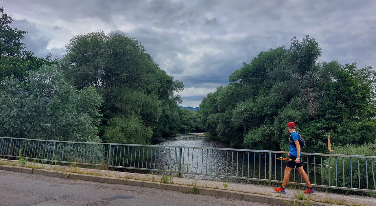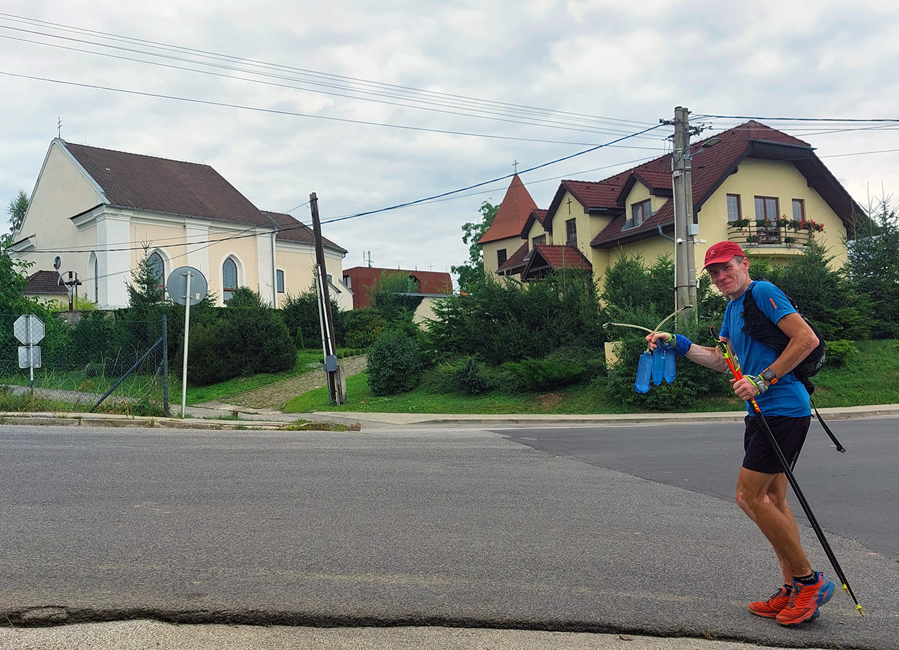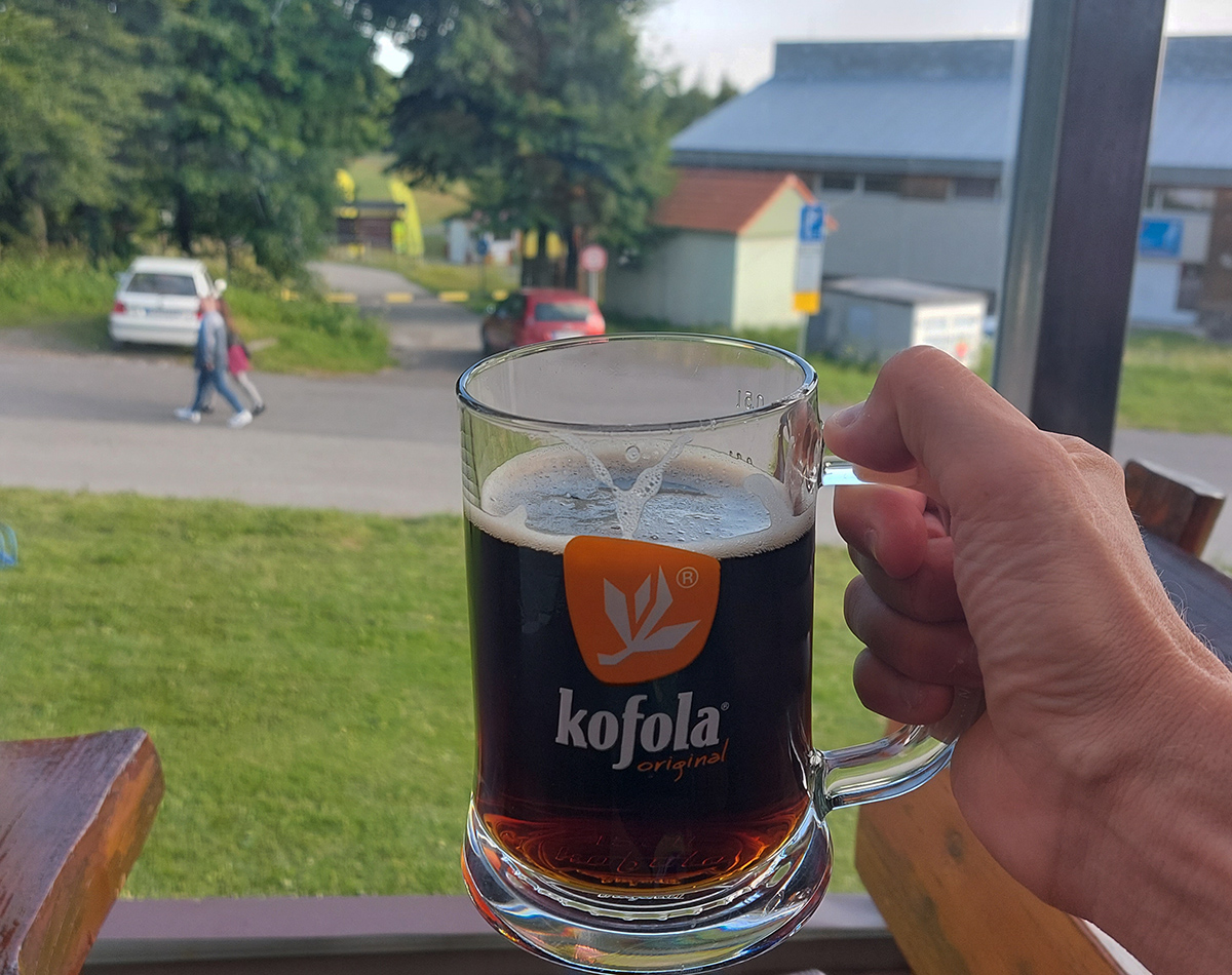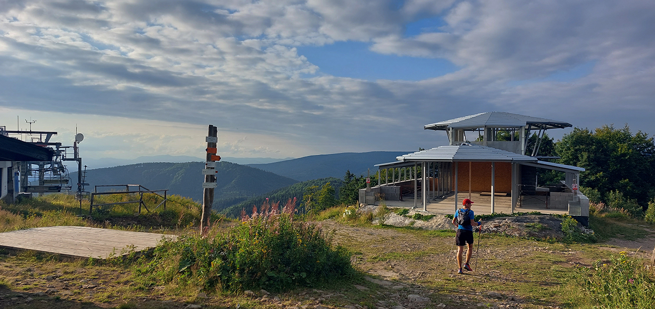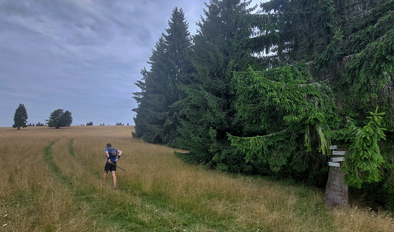 Pretože času sme mali stále doooosť a dole na vlak sme nesmeli pribehnúť zas príliš skoro, aby sme neklepali kosu na peróne, dovolili sme si ďalšiu kofču na slnkom vyhriatej terase. Predsa len, takto pred siedmou už sa vonku (aj keď na slnku) schyľovalo k jeseni, ako sa slnko schyľovalo k západu. A potom už dlhý zbeh na Krahule. Dosť proti slnku síce, ale mierny, teda celkovo v pohode. Lesmi, lúkami, dole krížom cez zjazdovky. Zaspomínal som si, kde som tu na lavičke raňajkoval takto pred štyrmi rokmi počas Koruny Turca . Dole v dedine nevkusné milionárske haciendy a bľakot karaoke – perfektné prostredie pre relax v lone prírody, ako si ho niektorí predstavujú. Pre nás ale hlavne začala posledná asfaltérčina smerom do stredu Európy. Cesta široká, len tým besným esúvéčkam sa bolo treba radšej uhýbať, oni proste musia ukazovať, akí sú páni všetkého.
