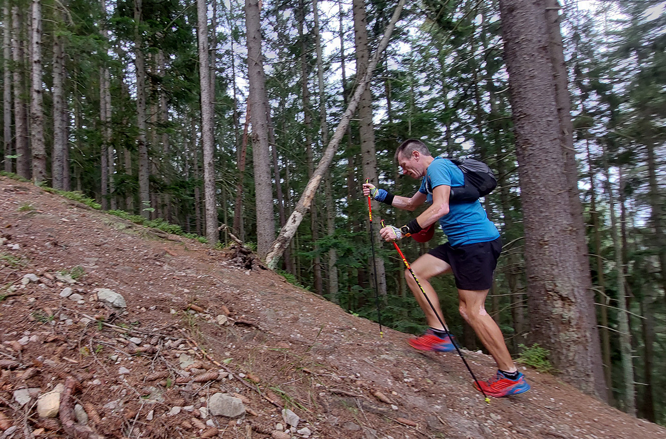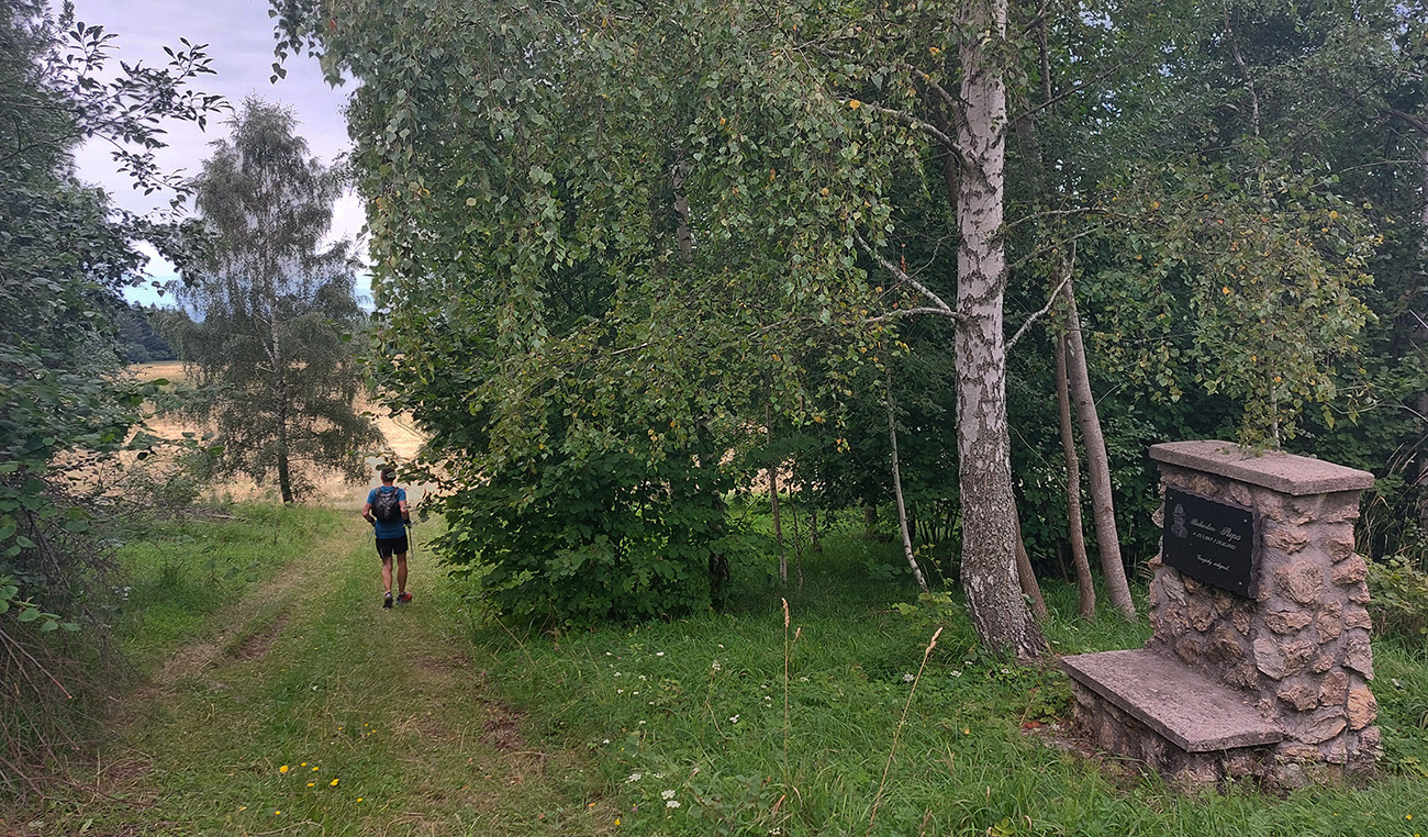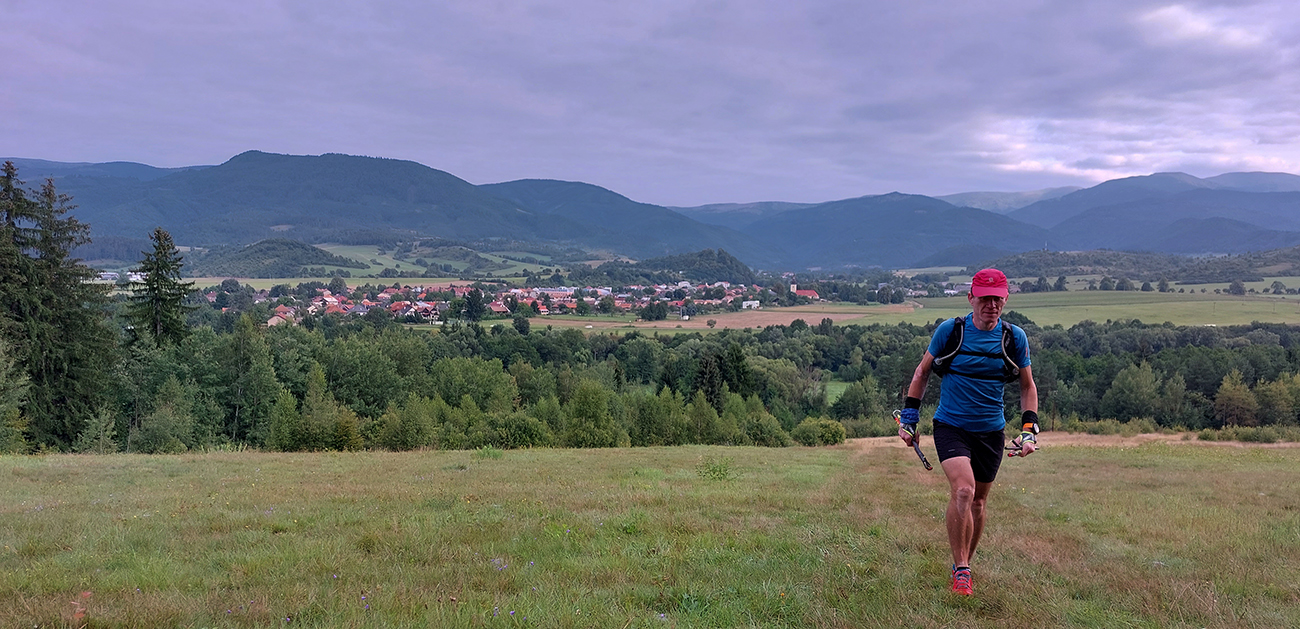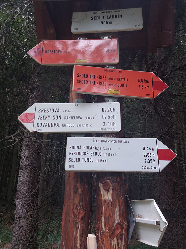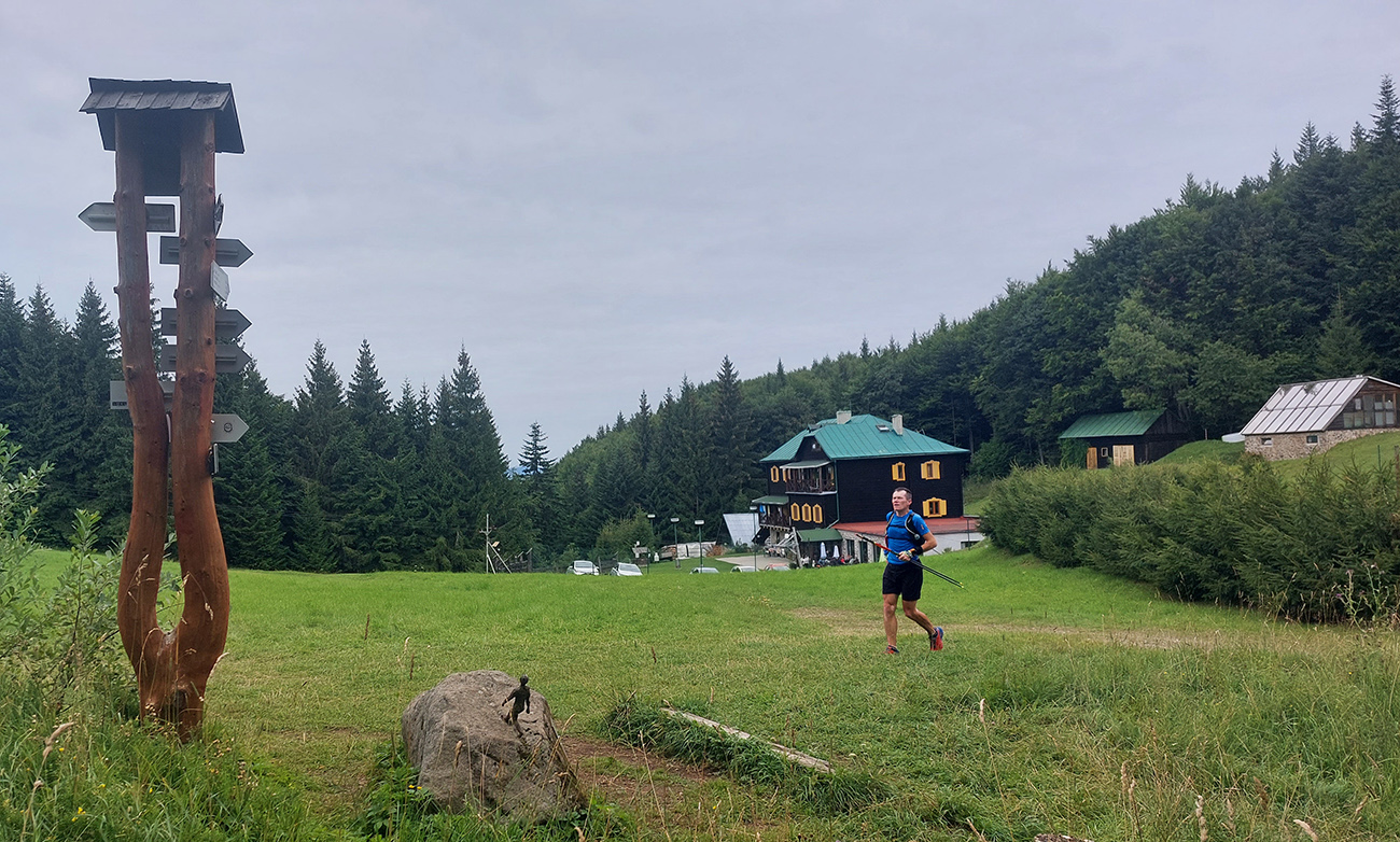 Ale všetko má svoj koniec a v sedle Laurín už sme vedeli, že stíhame v pohode. Časová rezerva viac ako dostatočná a pred nami krásne behateľný hrebeň Kremnických vrchov až po Skalku. Poslušne sme podali hlásenia domov, že to teda asi prežijeme a aj vlak stihneme, a už sme kluskali. Zase sa dalo vedľa seba a aj lepšie vykecávať, tak to chytro ubiehalo. Striedali sa križovatky, tabuľky kadejakých trás bežkových, bajkových aj pešiackych, sedlá a kríže a šutre s rúnovými nápismi a kadejaké iné pozoruhodnosti a keď začali pribúdať aj ľudkovia v prilbách a ferratových motúzoch zamotaní, to už sme boli na Skalke a z vyhliadky sme čumeli na vzdialený Ľubietovský Vepor, kde sme boli dávno ráno.