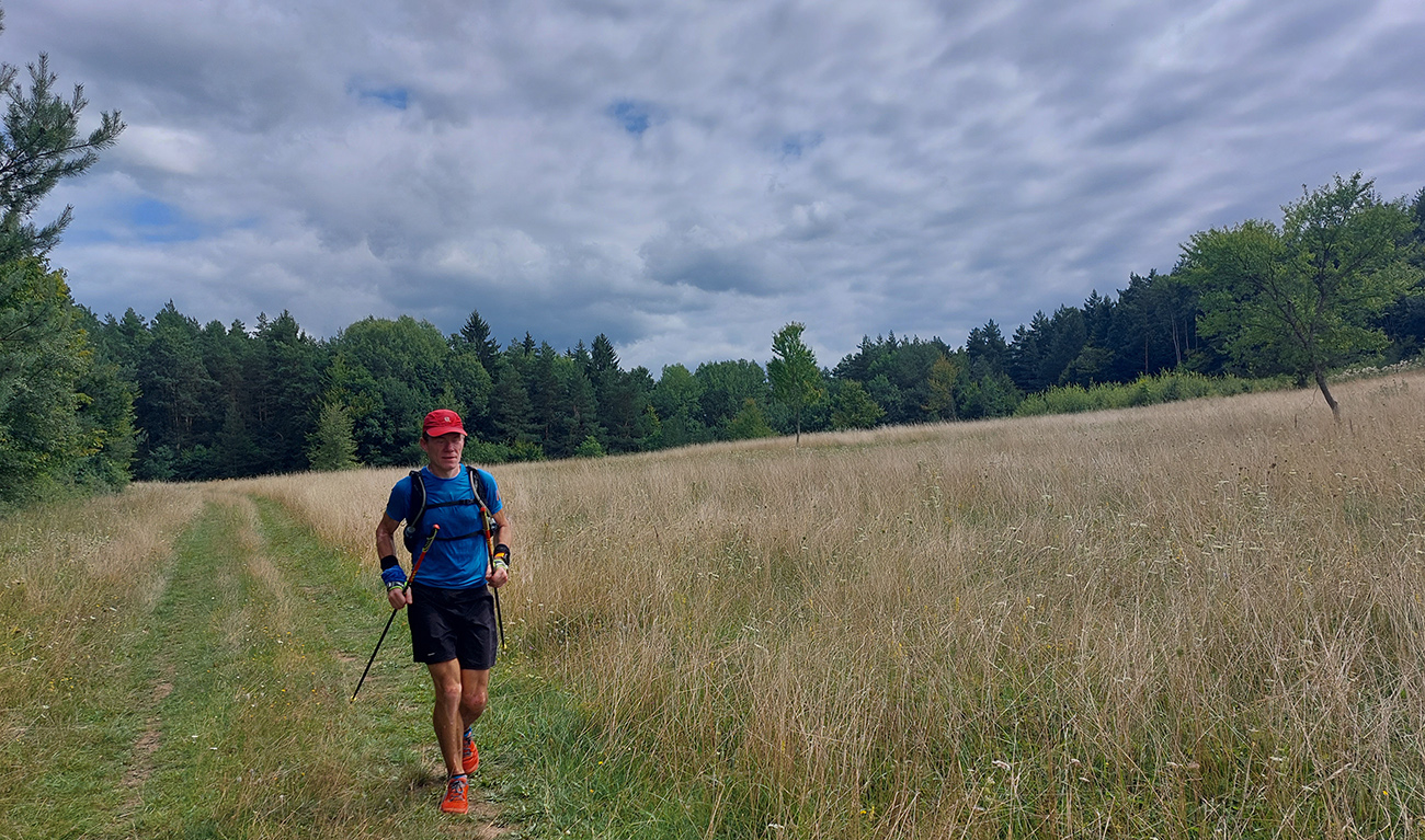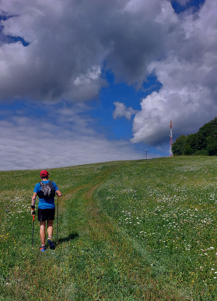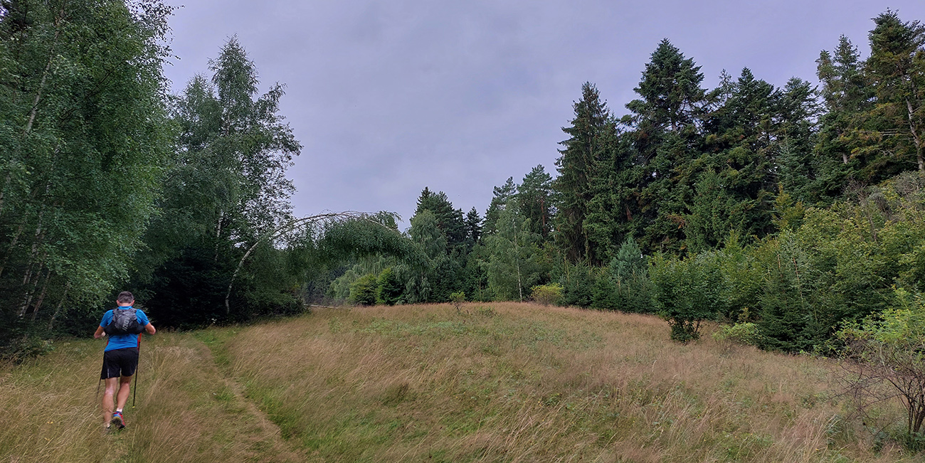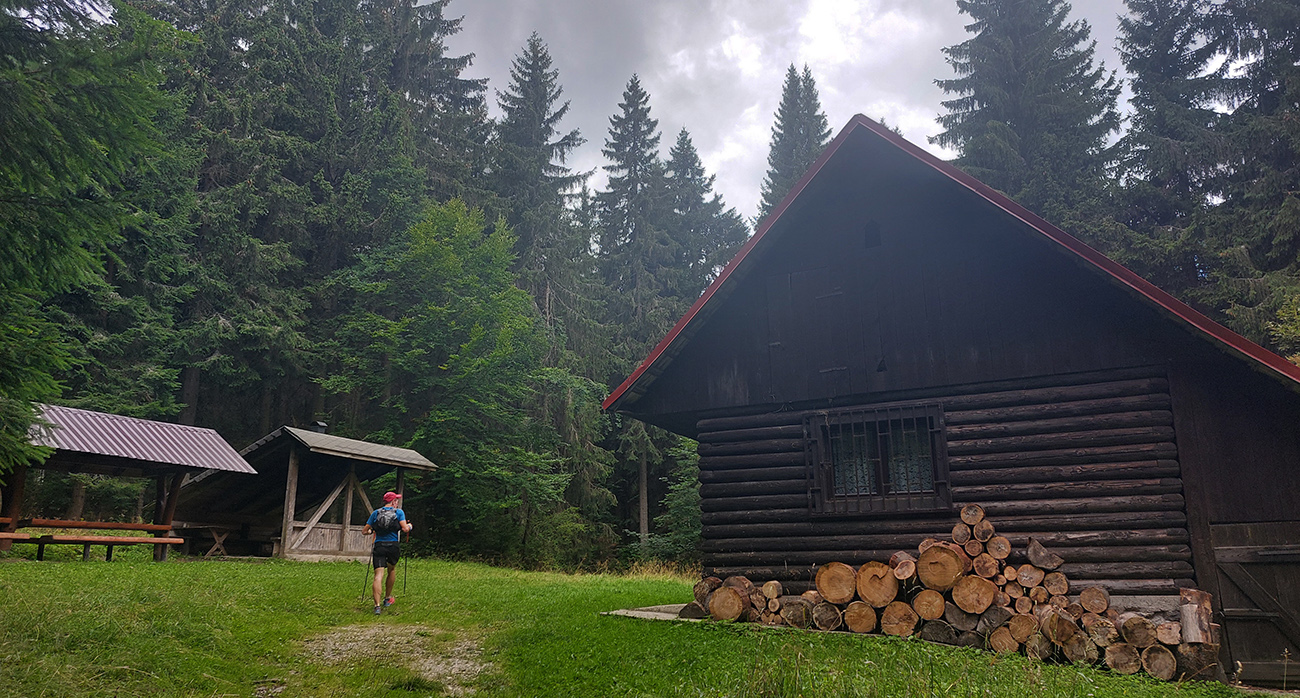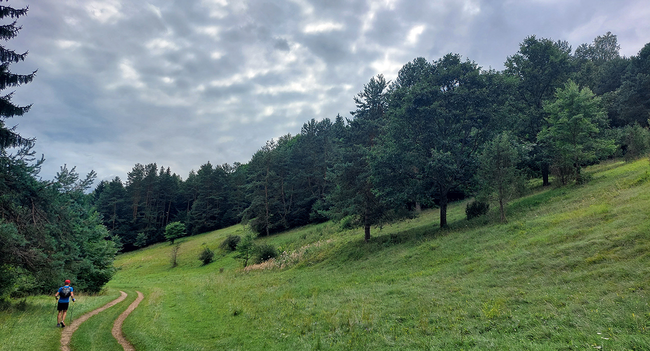 Ranný chlad a počasie pod mrakom vyhovovalo, lebo úvodný výšľap z Predajnej bol spočiatku pekne výživný. Modrá značka, ktorou asi veľa ľudí nechodí, lebo dubáky, kozáky a iné fajnotky trčali priamo na chodníku. Okrem nich ale často zavadzali aj kadejaké špicaté a tŕnisté prekážky, miestami aj políhané stromy vďaka búrke, ktorá sa len nedávno prehnala krajom. Majo nastolil tempo, ja som ledva fučal a len som dúfal, že sa pomaly rozbehnem. Vždy sa rozbieham len pomaly, len v poslednom čase akosi stále pomalšie :-) Pár miest, kde sme museli trochu porozmýšľať alebo do mapy kuknúť, inak pekný chodník zachovalým lesom, aj nejaké mierne zbehy na predýchanie, ku koncu veľká lúka a ani sme sa nenazdali, už sme boli pri chate pod Hrbom.
