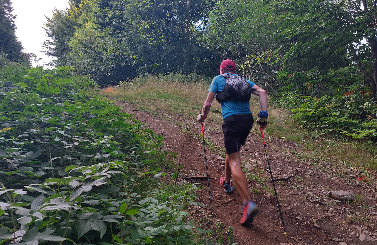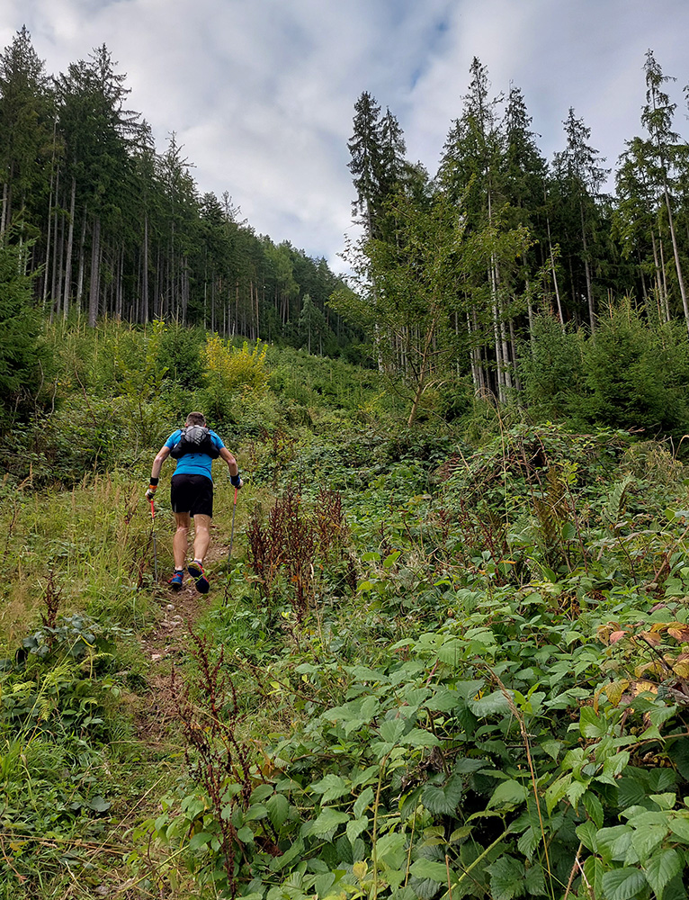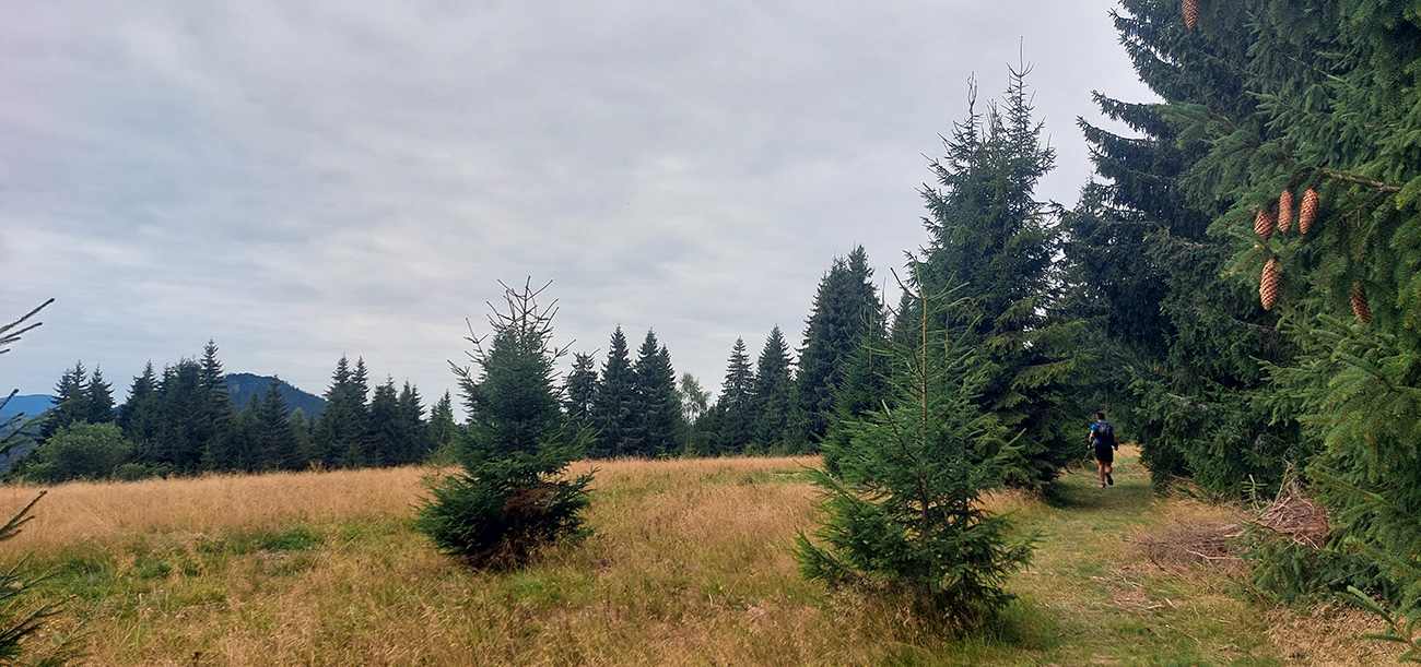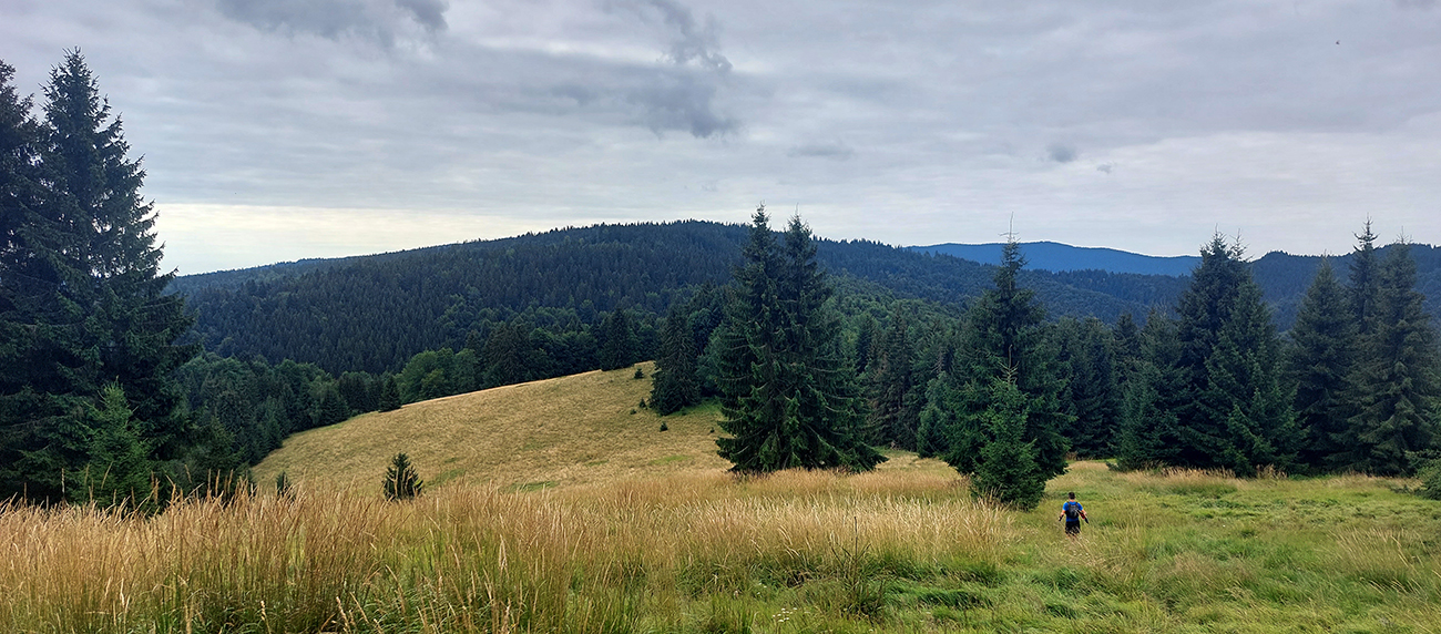 Ranný chlad a počasie pod mrakom vyhovovalo, lebo úvodný výšľap z Predajnej bol spočiatku pekne výživný. Modrá značka, ktorou asi veľa ľudí nechodí, lebo dubáky, kozáky a iné fajnotky trčali priamo na chodníku. Okrem nich ale často zavadzali aj kadejaké špicaté a tŕnisté prekážky, miestami aj políhané stromy vďaka búrke, ktorá sa len nedávno prehnala krajom. Majo nastolil tempo, ja som ledva fučal a len som dúfal, že sa pomaly rozbehnem. Vždy sa rozbieham len pomaly, len v poslednom čase akosi stále pomalšie :-) Pár miest, kde sme museli trochu porozmýšľať alebo do mapy kuknúť, inak pekný chodník zachovalým lesom, aj nejaké mierne zbehy na predýchanie, ku koncu veľká lúka a ani sme sa nenazdali, už sme boli pri chate pod Hrbom.