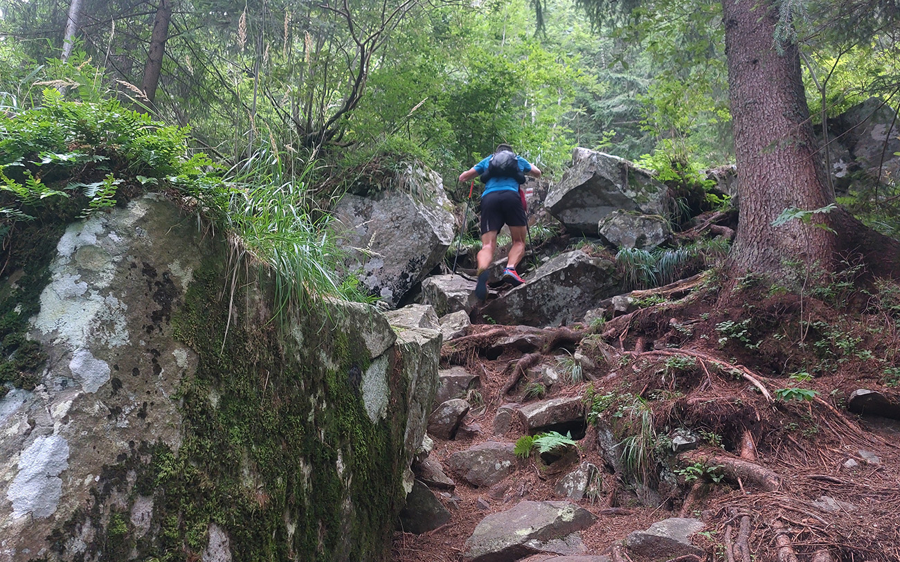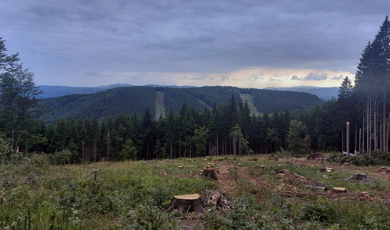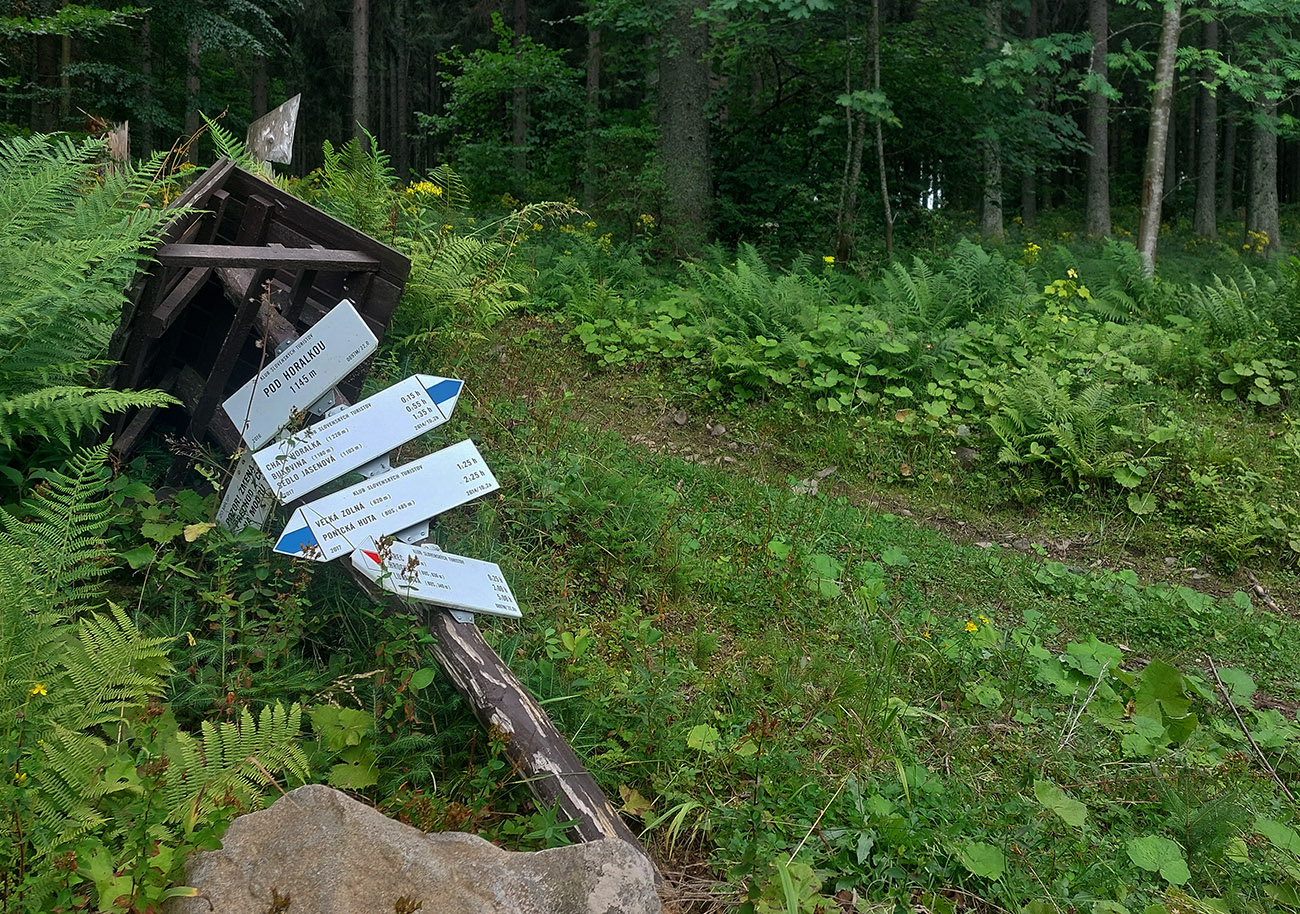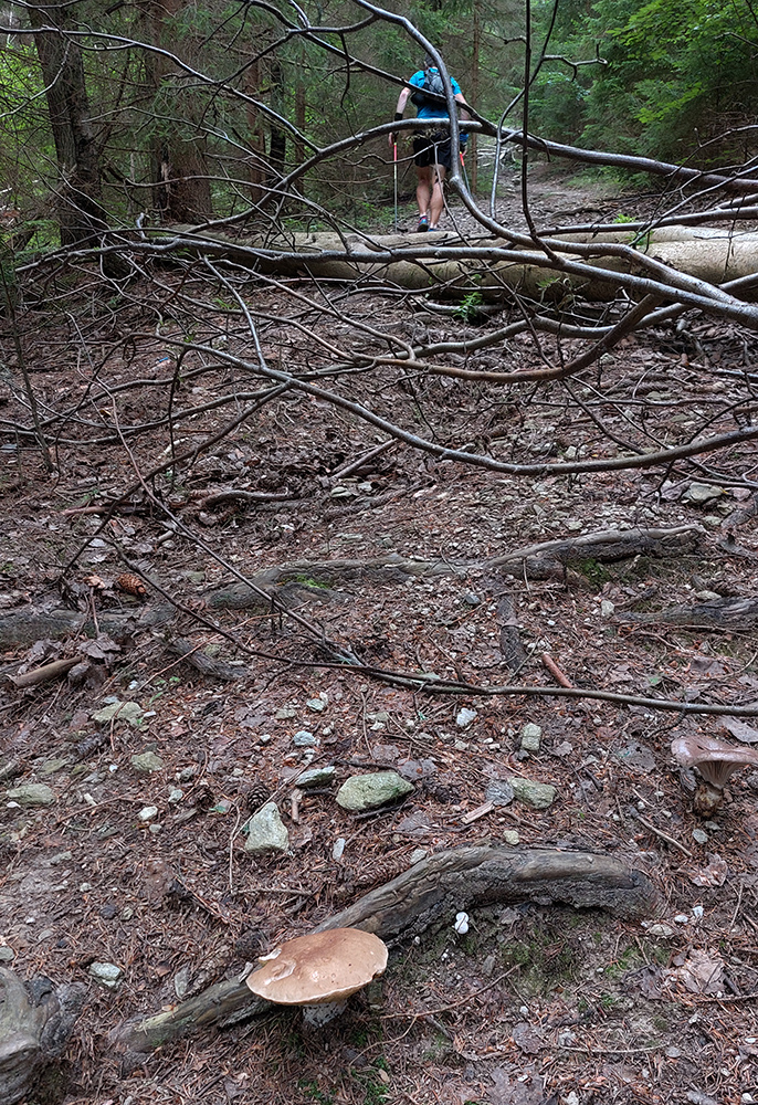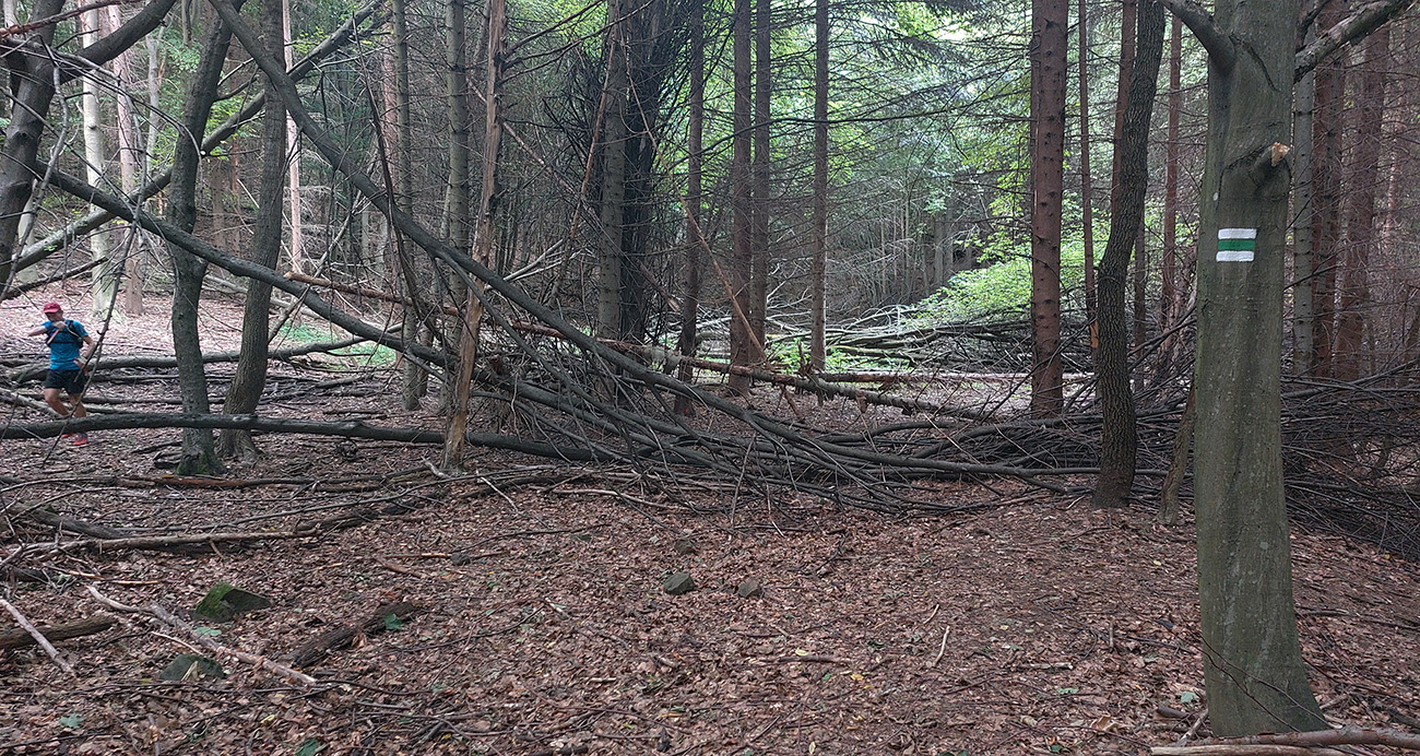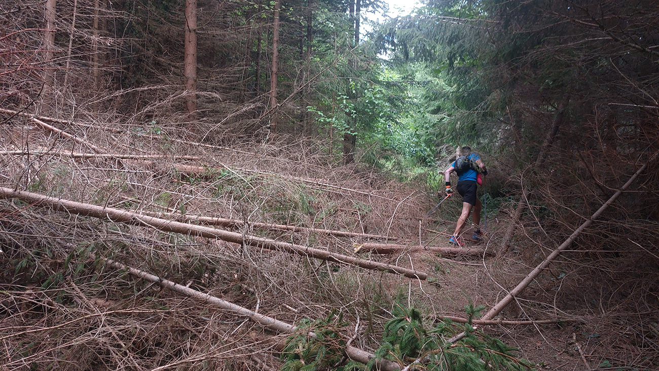 Vstup do lesa, to bola zelená značka na Laurín a nebola to žiadna veľká výhra. Ani tade asi veľmi nikto nechodí, navyše chodník dosť často zahádzaný – ozaj sa tá posledná búrka poriadne vyblbla. Do toho keď sme prechádzali rúbaňami, niekde ani pod nohy nebolo vidieť. Lesy také nič moc, výhľady žiadne, aj kiláky v nohách už robili svoje – proste dlhé a nudné stúpanie. Len pár svetlých momentov, keď bol terén miernejší či behavejší, alebo keď cez rúbanisko nejaký ten výhľad presvitol.