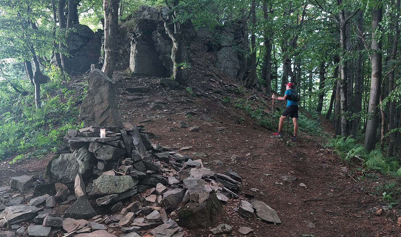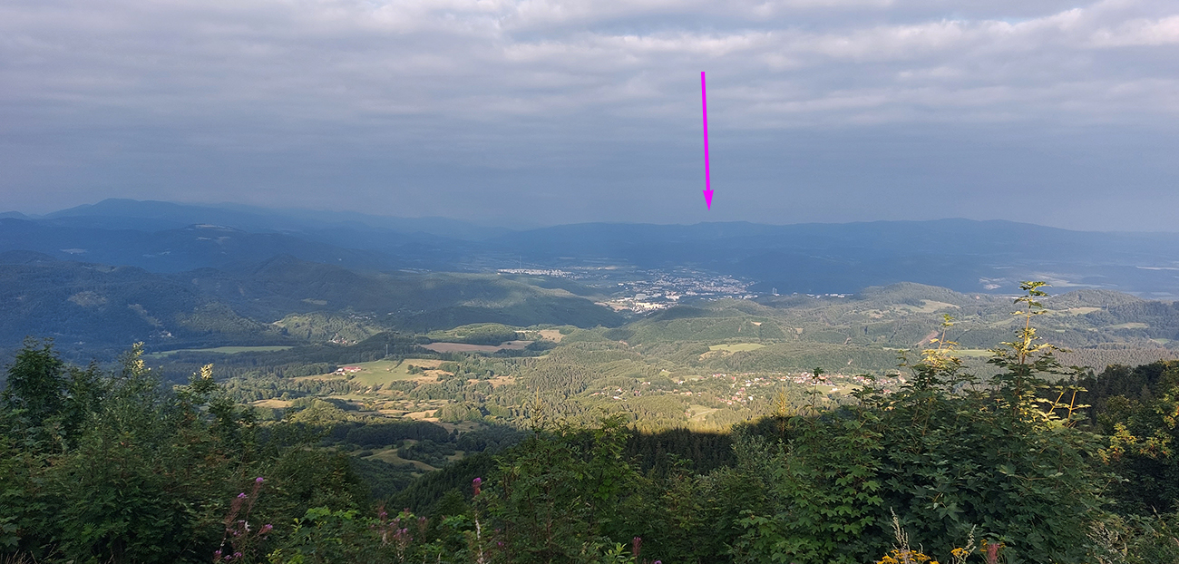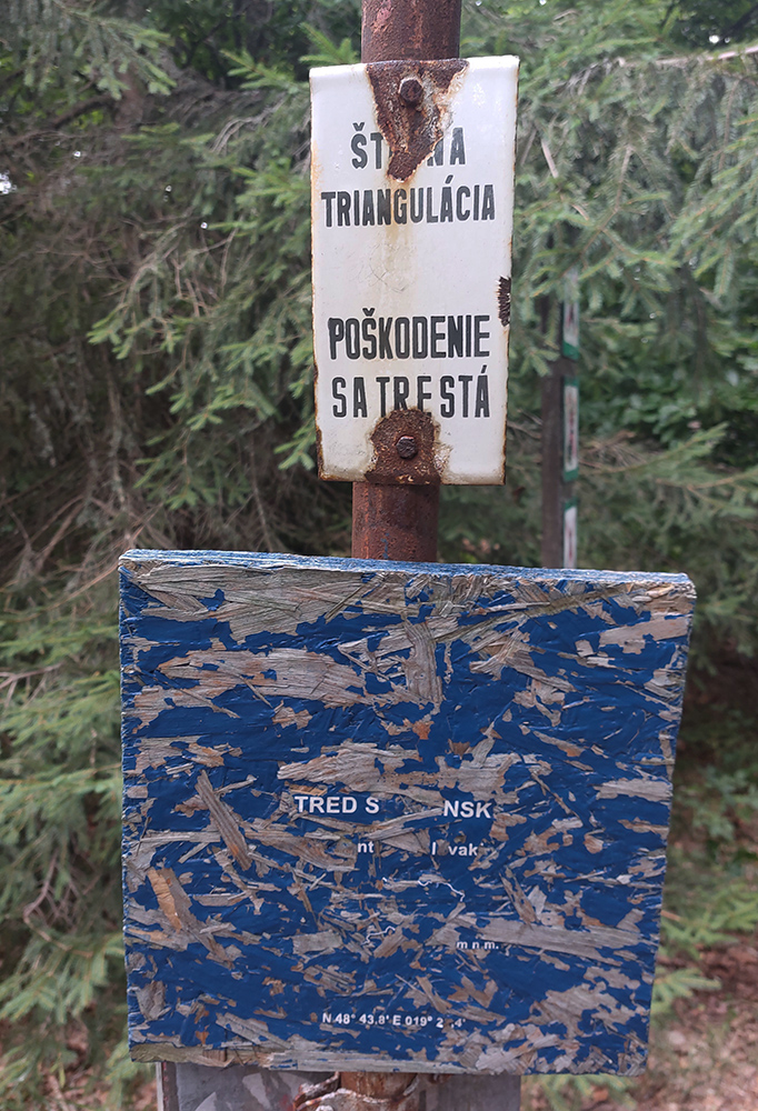 Krátke chodecké intermezzo a malá horolezecká vložka pomedzi balvany, ošumelý oznam o strede Slovenska na tabuľke na Hrbe, ďaleké výhľady vďaka vyčistenému vzduchu a už sme kľučkovali ďalej na juh. Jeden z výhľadov bol aj na ďaleký západ, kde k nebu trčí vysielač na Skalke, náš vzdialený skoro cieľ. Takmer celú trasu k nemu sme mohli vidieť. Kalamitné preliezačky a obchádzačky krížom cez chodník buď boli menej časté, alebo prečistené oproti vlaňajšku, alebo mi len nepripadali také hnusné, ako keď som sa na nich trápil počas Koruny Banskej Bystrice .