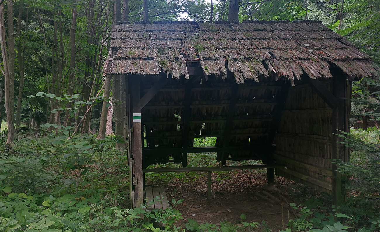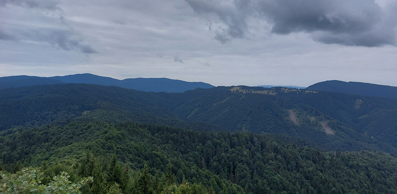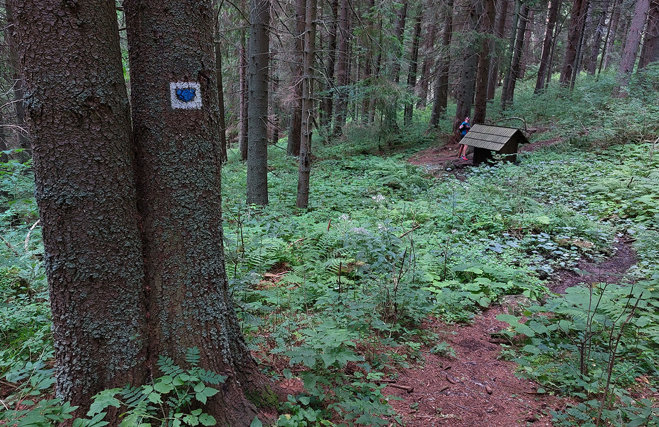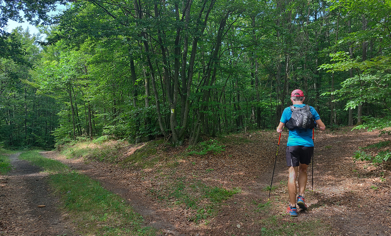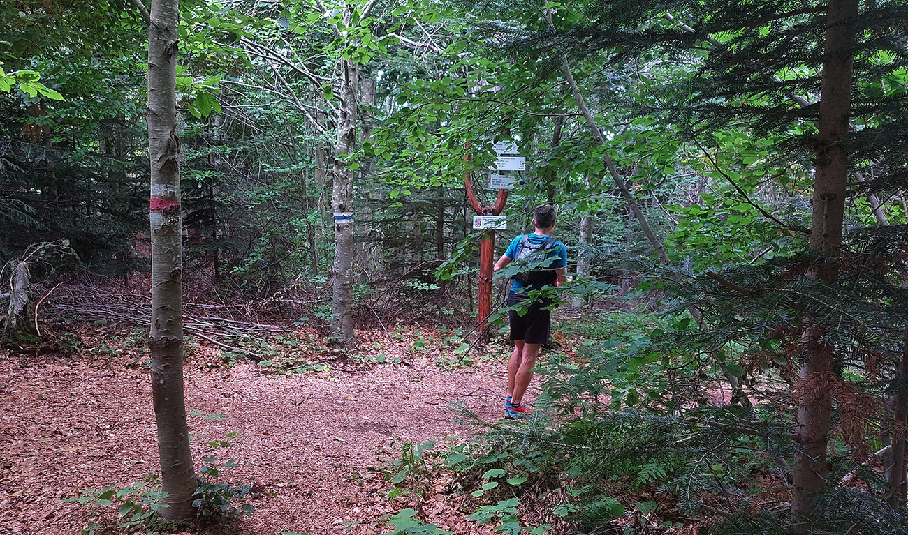 Pri smerovníku Krížne sme zmenili smer aj značku znovu za modrú a po príjemných lesných cestách sme valili smerom na Hrochoť, po severnom okraji „krátera“ Poľany. Aj tu sa nejaký jeden – dva výhľady cez dolinu vyskytli. Cesta na pohľad jasná, ale skúsenosť nám hovorila, že treba zaostrovať pozornosť, najmä na križovatkách – neboli vždy stopercentne označené, zvlášť potom na miestnej červenej značke bližšie ku Hrochoti. Napriek tomu sme si na Kruhoch dovolili odbočku zo značky na jednu z menších plánovaných skratiek. Predsa len, časový harmonogram nám veľa možností na blúdenie ani ulievanie nedával. Ešte sme si nemohli byť istí, či ten vlak stihneme.