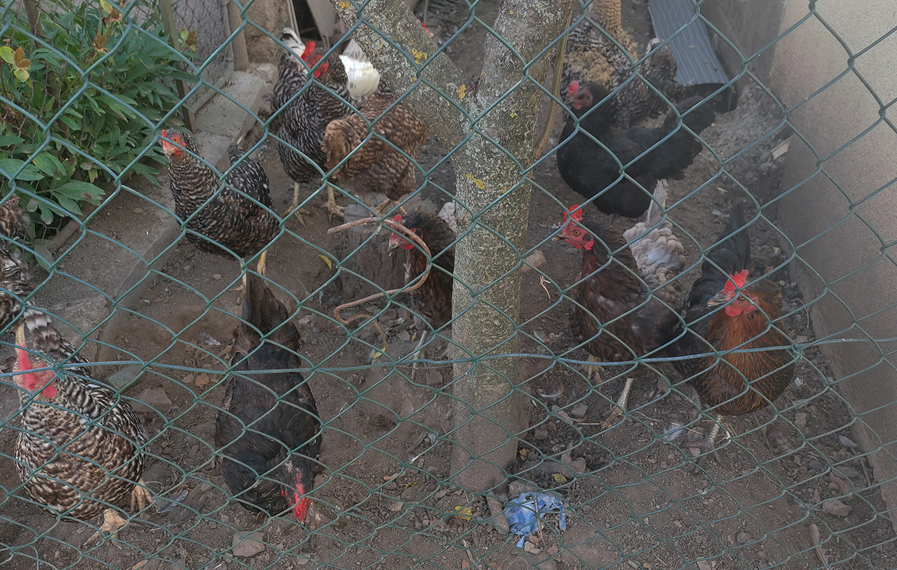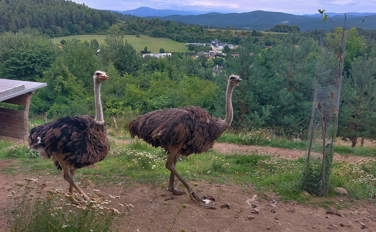 Napriek tomu po porade sme odmietli strašne dlhú (asi 200-metrovú) zachádzku do vodáckeho kempu pri Hrone, lebo by tam bol okrem iného isto aj hnusný chládok pod stromami :-) Radšej sme sa vybrali asfaltovať do Badína, že tam nejakú krčmu nájdeme, kde na chvíľu zakempujeme. Premávka na starej ceste do Sliača bola poriadna, na diaľnici dokonca zápcha, no pracovný piatok, čo by sme chceli? Ešte že sme boli peši a krížom a z nadhľadu, hehe... Akurát v Badíne krčma presne na opačnej ulici a vracať sa nám nechcelo, tak zase žobranie od domácich. V blízkom kňazskom seminári sme mohli skúsiť – možno by sme dostali silnejšiu, svätenú :-) A išlo sa ďalej. Našťastie sme tu boli o viac ako hodinu skôr oproti najhoršiemu možnému scenáru, tak sme si mohli dovoliť nehrotiť to. Dedina natiahnutá a do kopca, tak to nešlo bársako rýchlo, ale po serpentínke ponad milionárske haciendy sme sa dočkali – konečne preč z asfaltu do lesa. Predtým sme ešte nakŕmili miestne pštrosy cez plot púpavou. No pažravé boli poriadne, ako by im gazda nedával :-)