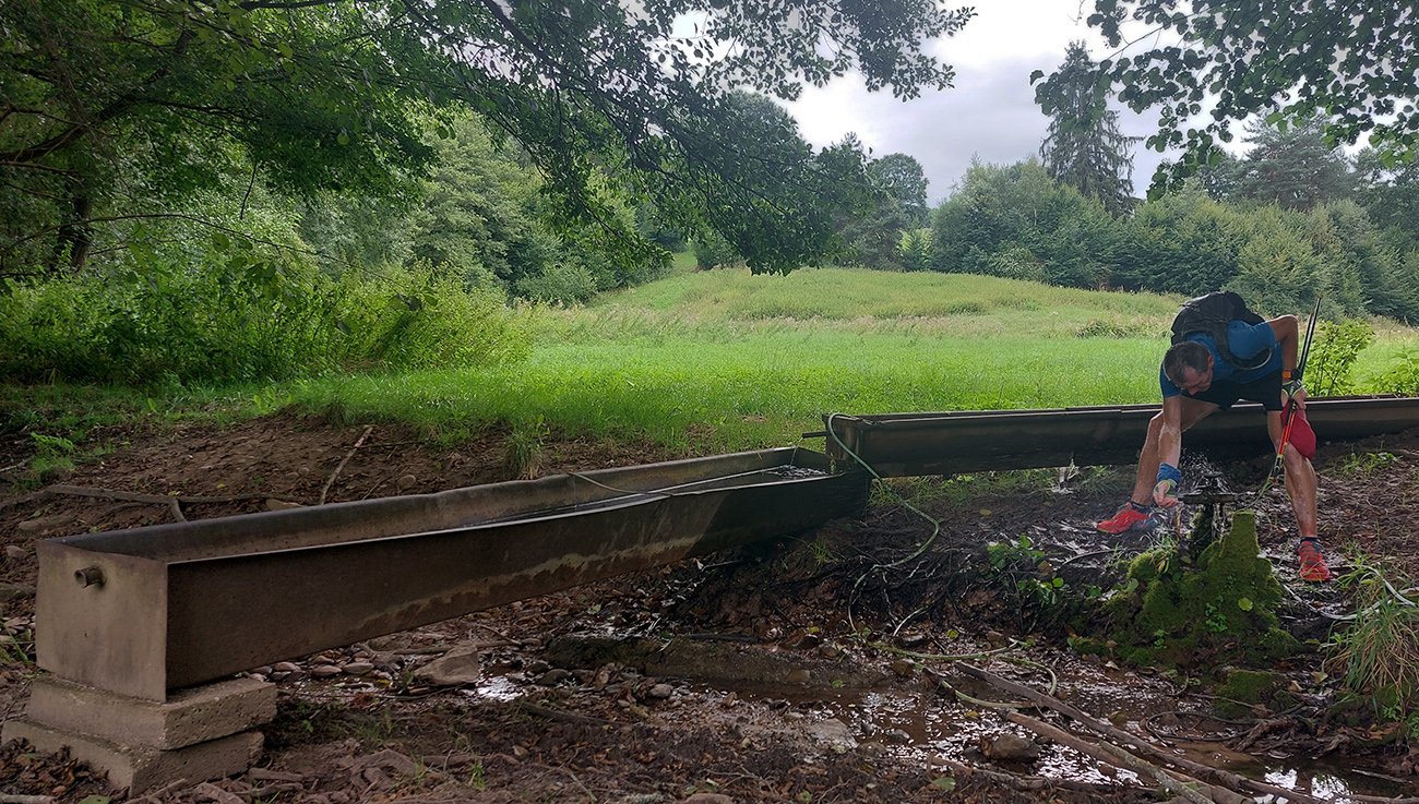Na Mičinej ozaj čapovali a samozrejme náš obľúbený hnedý originál – len tak zasyčal dole krkmi! Ku kofči keksíky a zas niečo z batôžka, 10 minút a už sme pajdali hore dedinou. Na rozchodenie asfalt k ovčínu a potom dlhý, mierny zbeh po hline Peťovskej doliny do Vlkanovej. Našťastie v doline ešte fungujú napájadlá, aj keď pasie sa tam už veľmi málo. Kedysi „do golfova“ vystrihané trávniky už dnes zarastajú kadejakou burinou a celá dolinka je síce stále pekná, ale už začína vyzerať trochu spustnuto. Ešte aj to slnko do nás začínalo poriadne biť, blížili sme sa k najnižšiemu bodu výletu. Prehupli sme sa aj do druhej polovice trasy a nohy už sme trochu cítili.